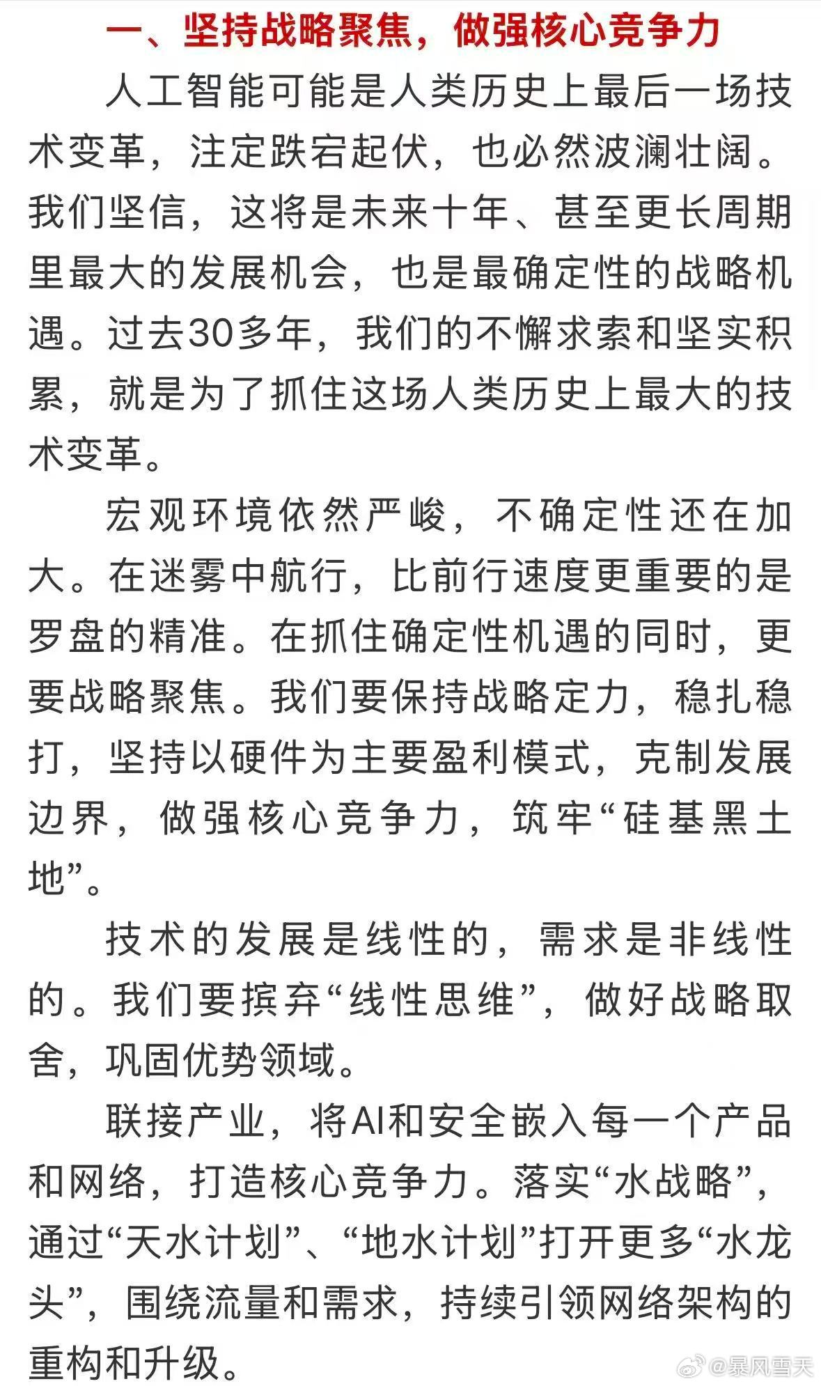 这篇致辞里的“战略聚焦”,说得特别实在。在满是不确定性的环境里,不贪多、不跟风,反而把力气往核心赛道上扎,这才是真清醒 。很多企业一遇风口就乱了阵脚,什么都想做,最后啥都没做好。而它选择克制边界,把根技术、核心能力做扎实,用长期投入换确定性机会 。这种“少即是多”的定力,比盲目扩张更有力量。说到底,战略聚焦不是保守,是在迷雾里认准方向、攥紧拳头,把每一分力气都用在刀刃上,才能走得稳、走得远