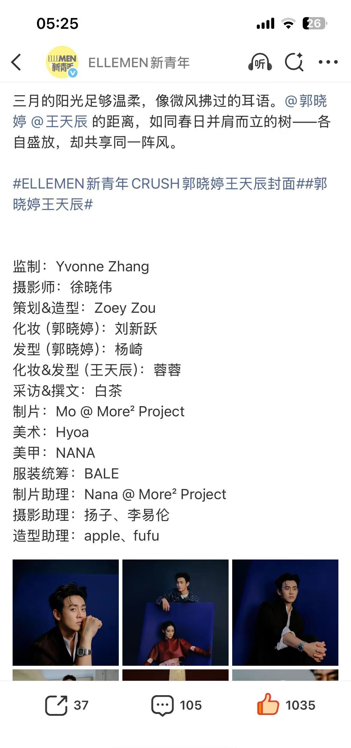 三月的阳光足够温柔,像微风拂过的耳语。@郭晓婷 @王天辰 的距离,如同春日并肩而立的树——各自盛放,却共享同一阵风。ELLEMEN新青年CRUSH郭晓婷王天辰封面郭晓婷王天辰 监制:Yvonne Zhang摄影师:徐晓伟 策划&造型:Zoey Zou化妆(郭晓婷):刘新跃 发型(郭晓婷):杨崎化妆&发型(王天辰):蓉蓉采访&撰文:白茶制片:Mo @ More² Project美术:Hyoa美甲:NANA服装统筹:BALE制片助理:Nana @ More² Project摄影助理:扬子、李易伦造型助理:apple、fufu