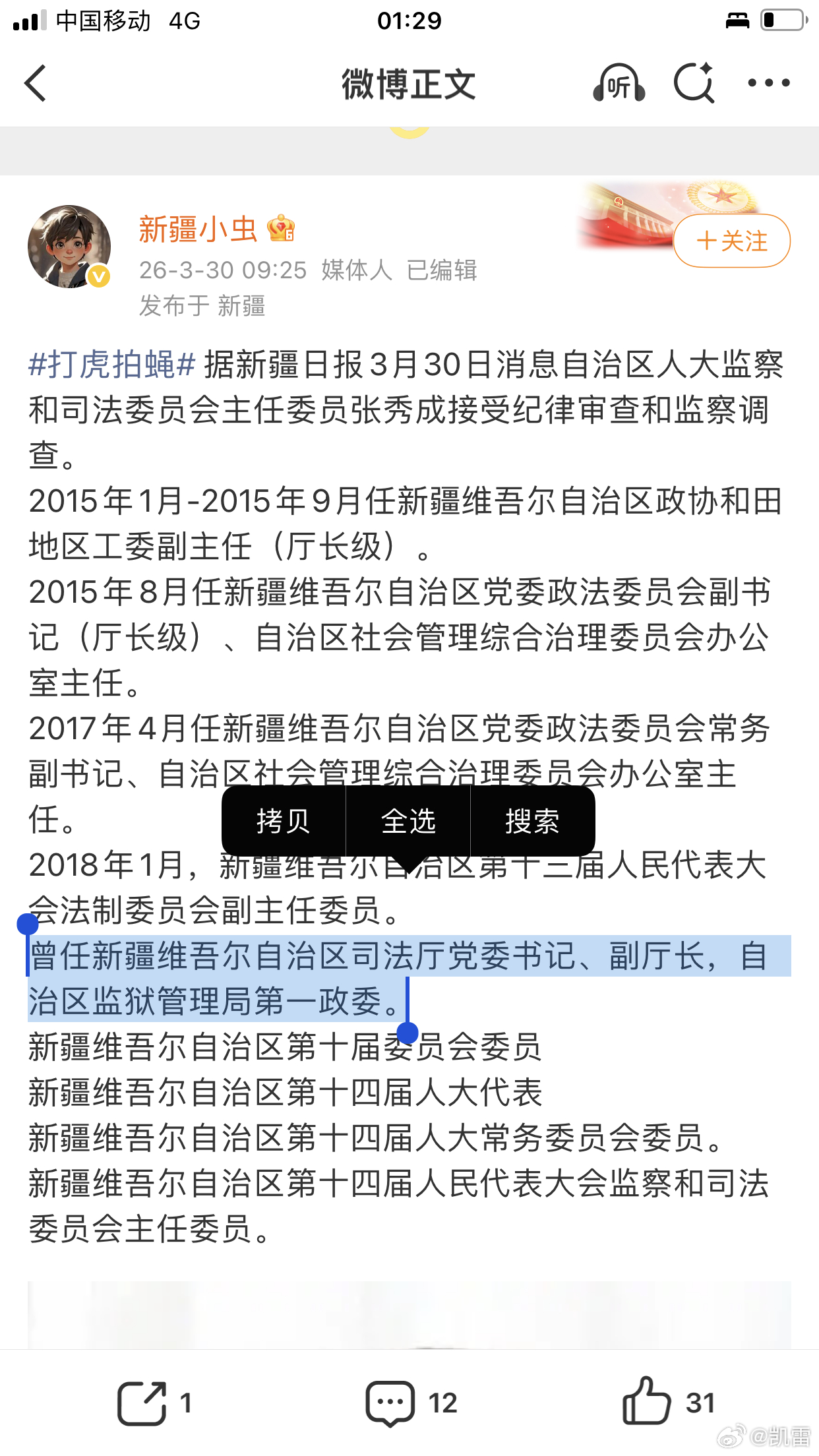 曾经新疆维吾尔自治区司法厅党委书记、副厅长,自治区监狱管理局第一政委张秀成,终于落马。