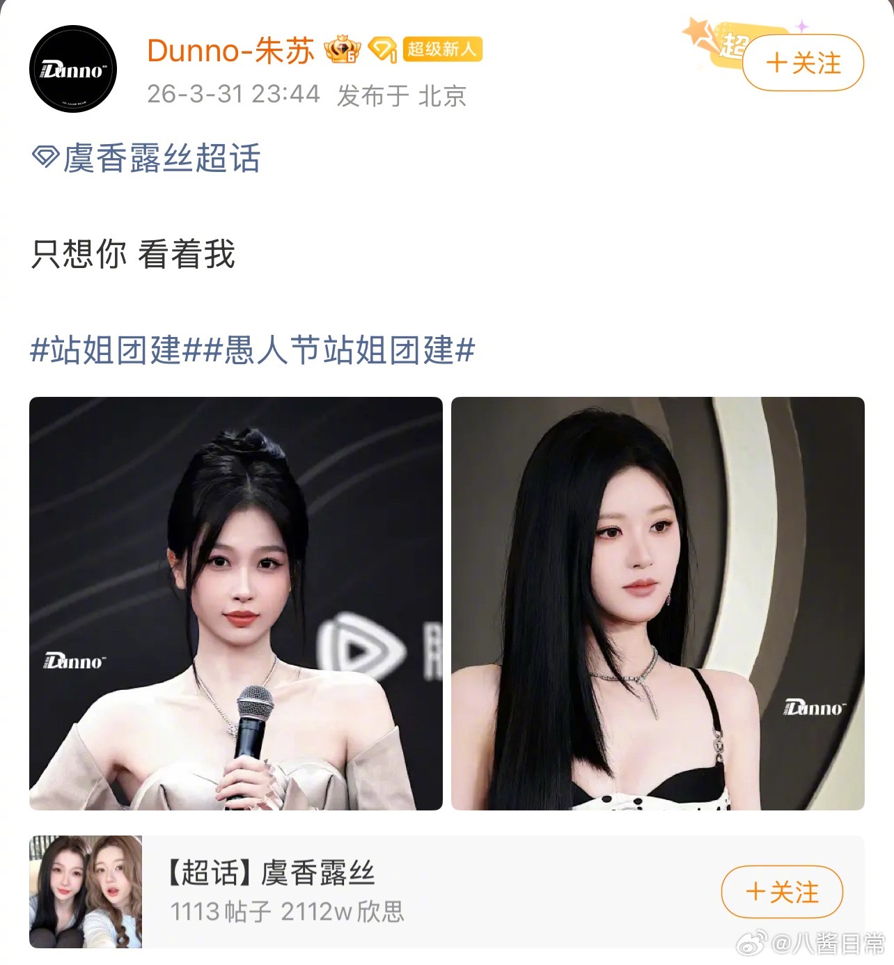 愚人节站姐团建开始了,朱苏站姐发了“虞香露丝”虞书欣、赵露思站姐团建愚人节