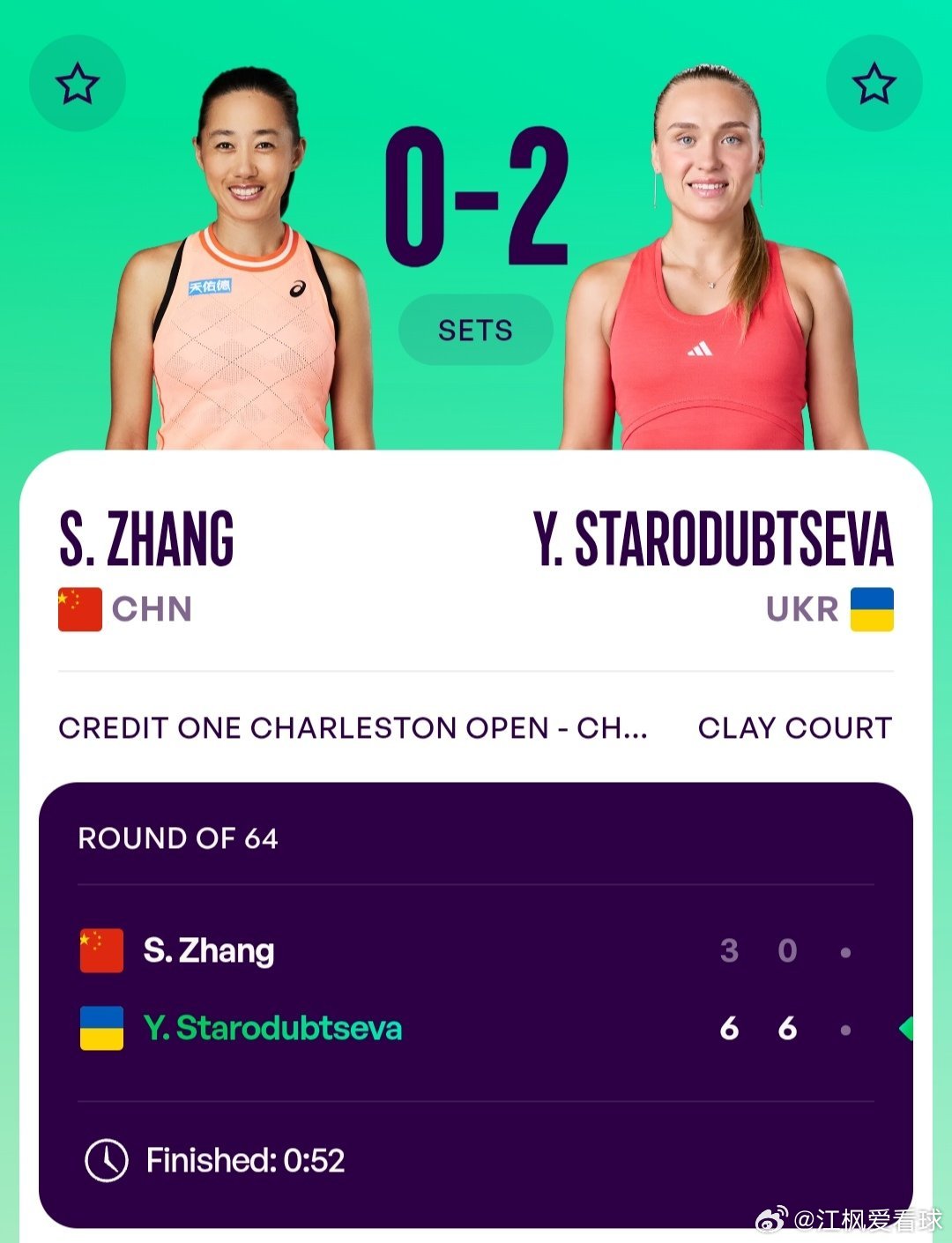 老将张帅🇨🇳3-6/0-6不敌斯塔罗杜布采娃🇺🇦,无缘晋级。接下来双打搭档克鲁尼奇🇷🇸,是赛会双打头号种子,张帅🇨🇳/克鲁尼奇🇷🇸组合双打加油!
