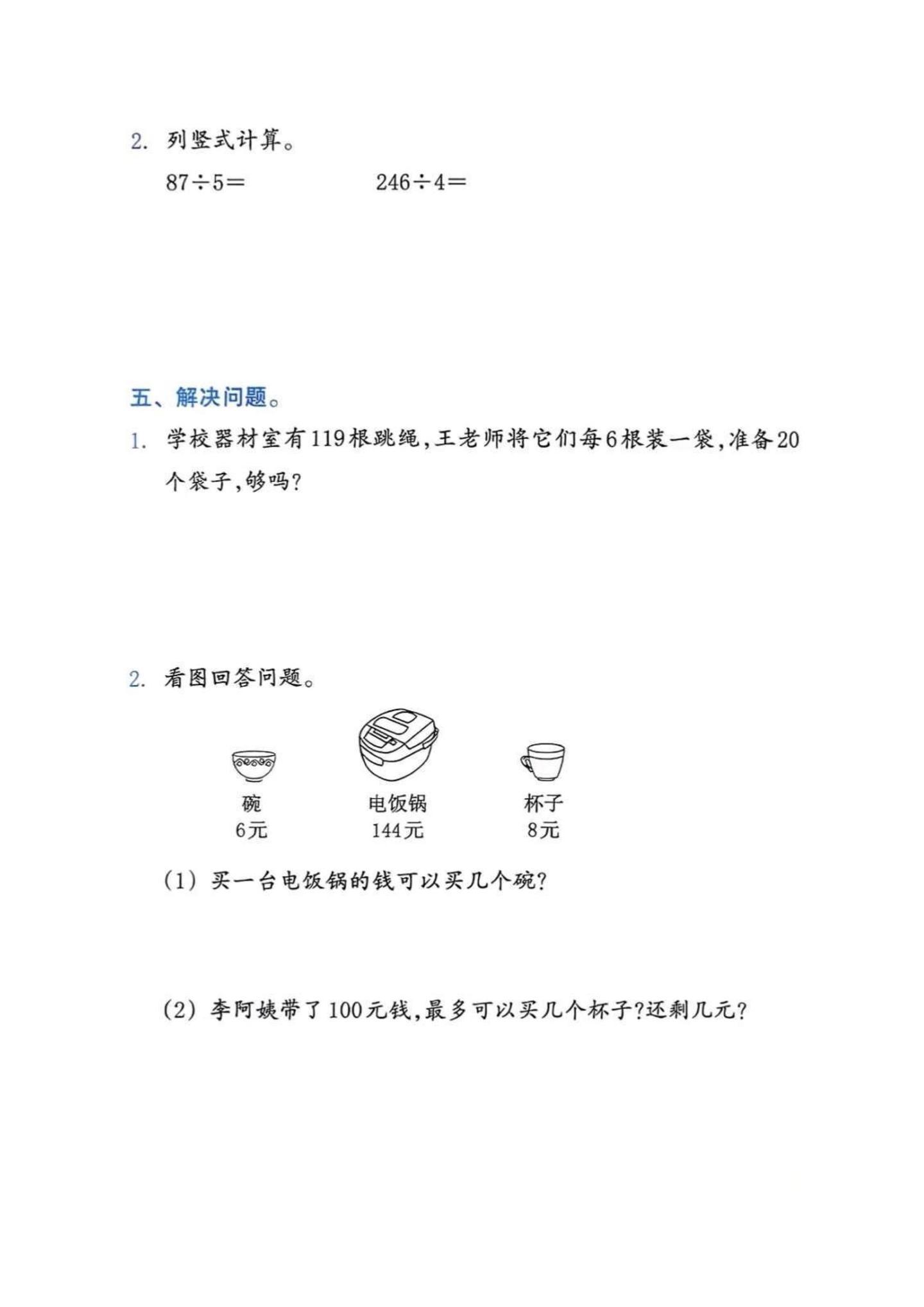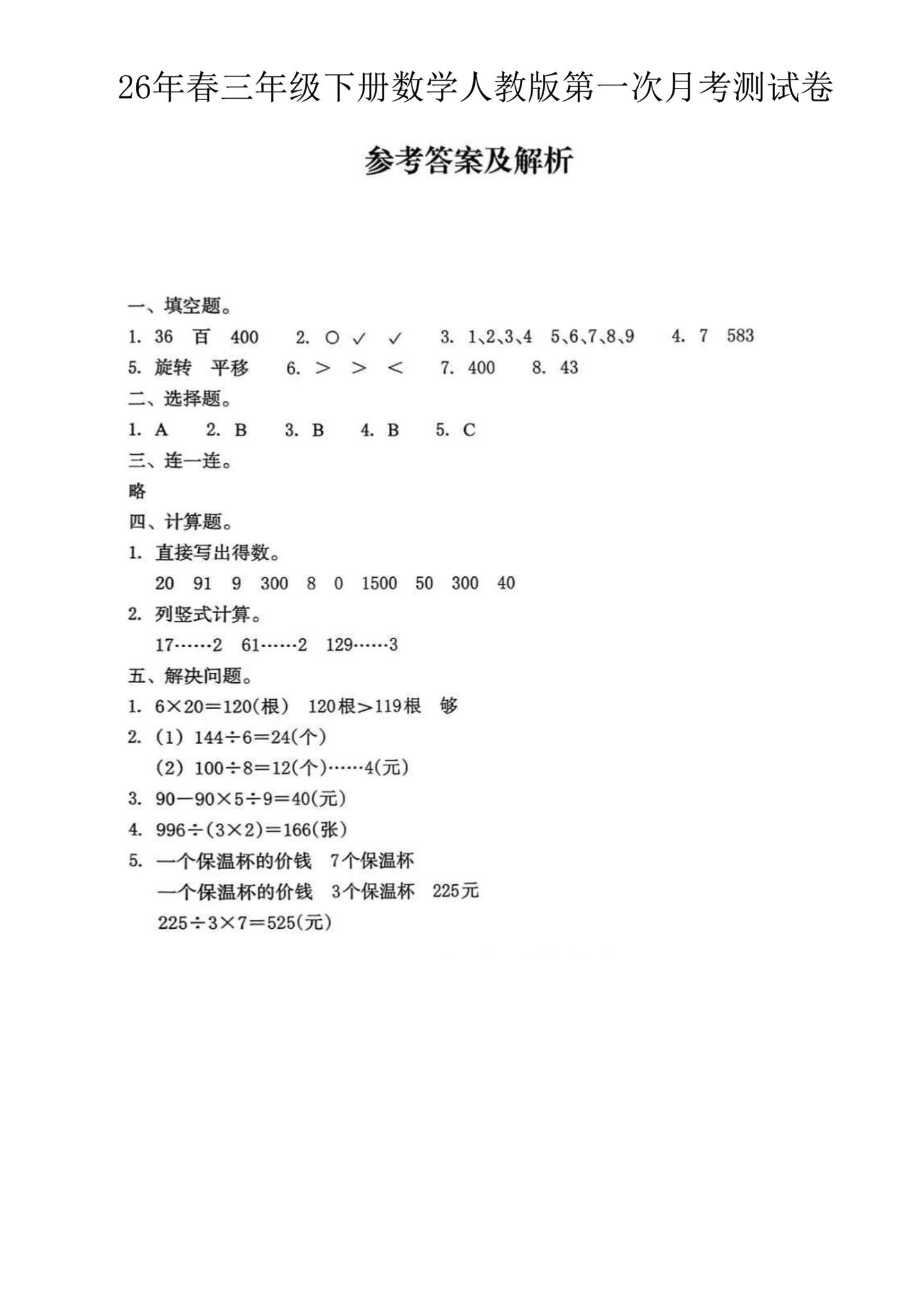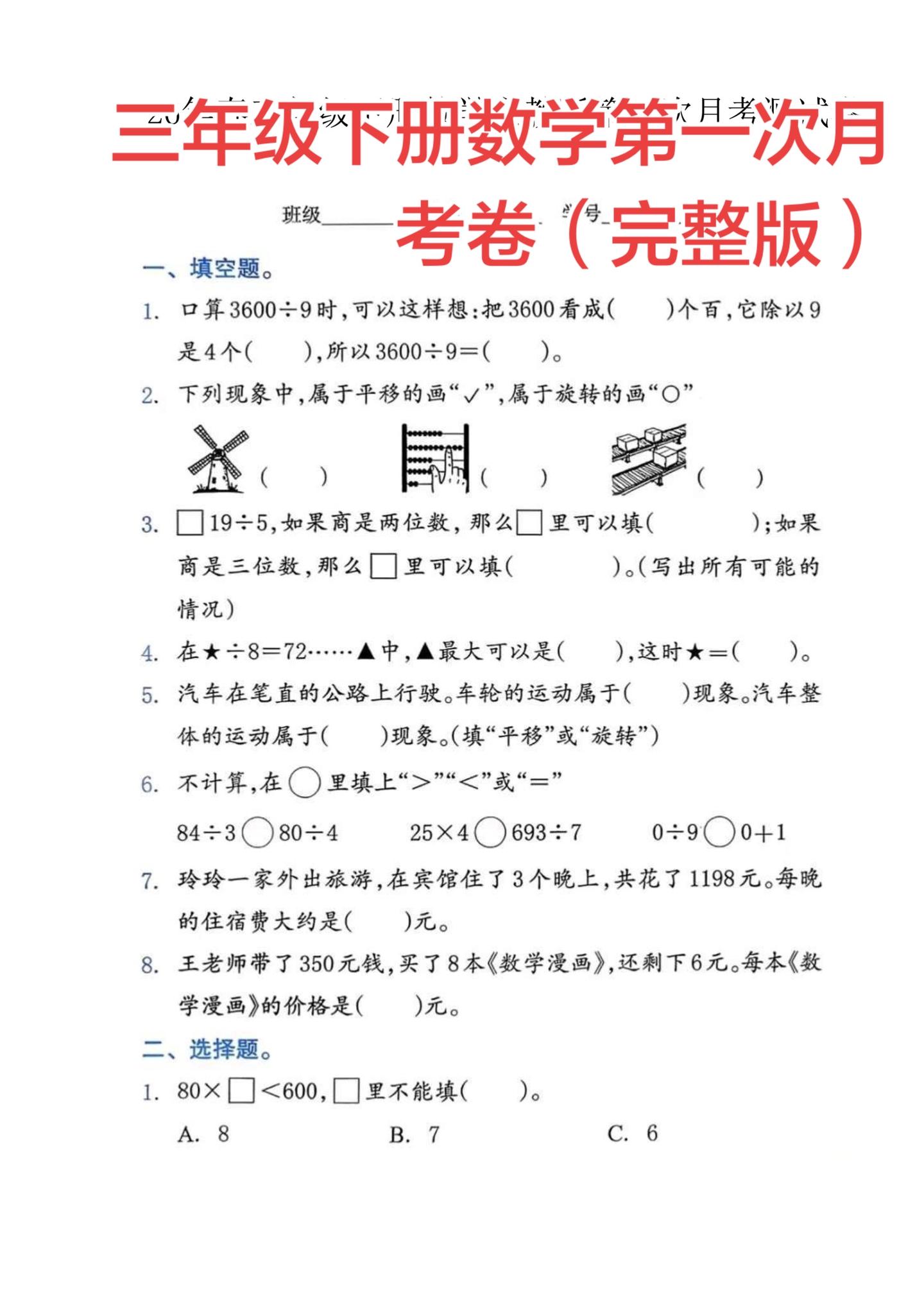 三年级下册数学第一次月考完整试卷(含答案。孩子最近数学学除法、平移旋转有点吃力? 把这份第一次月考卷打印出来,做做就能看出问题点。 我已经整理好了,直接给孩子练一练吧~