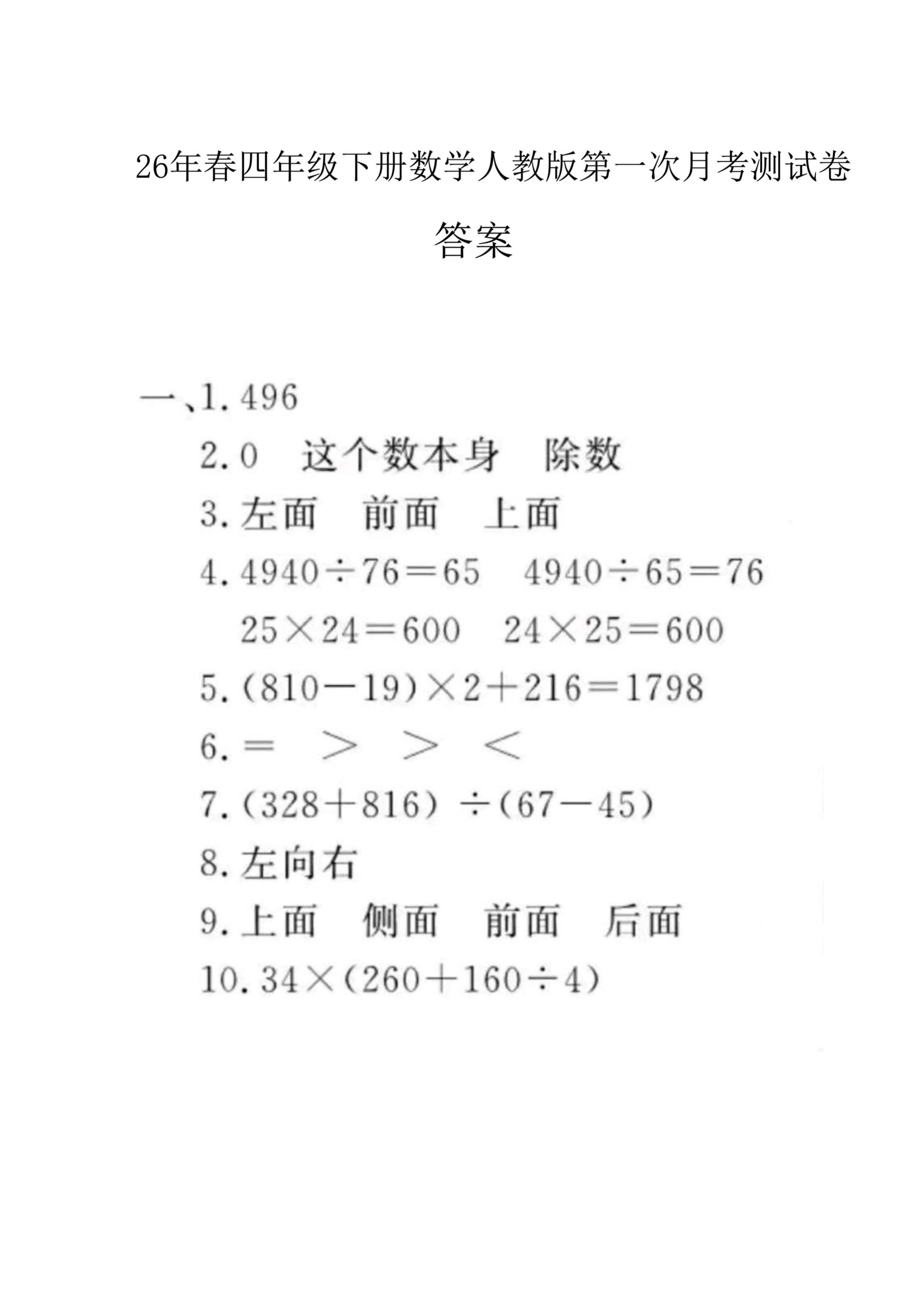四年级下册数学第一次月考卷|人教版附答案。家有四年级娃的看过来👀人...