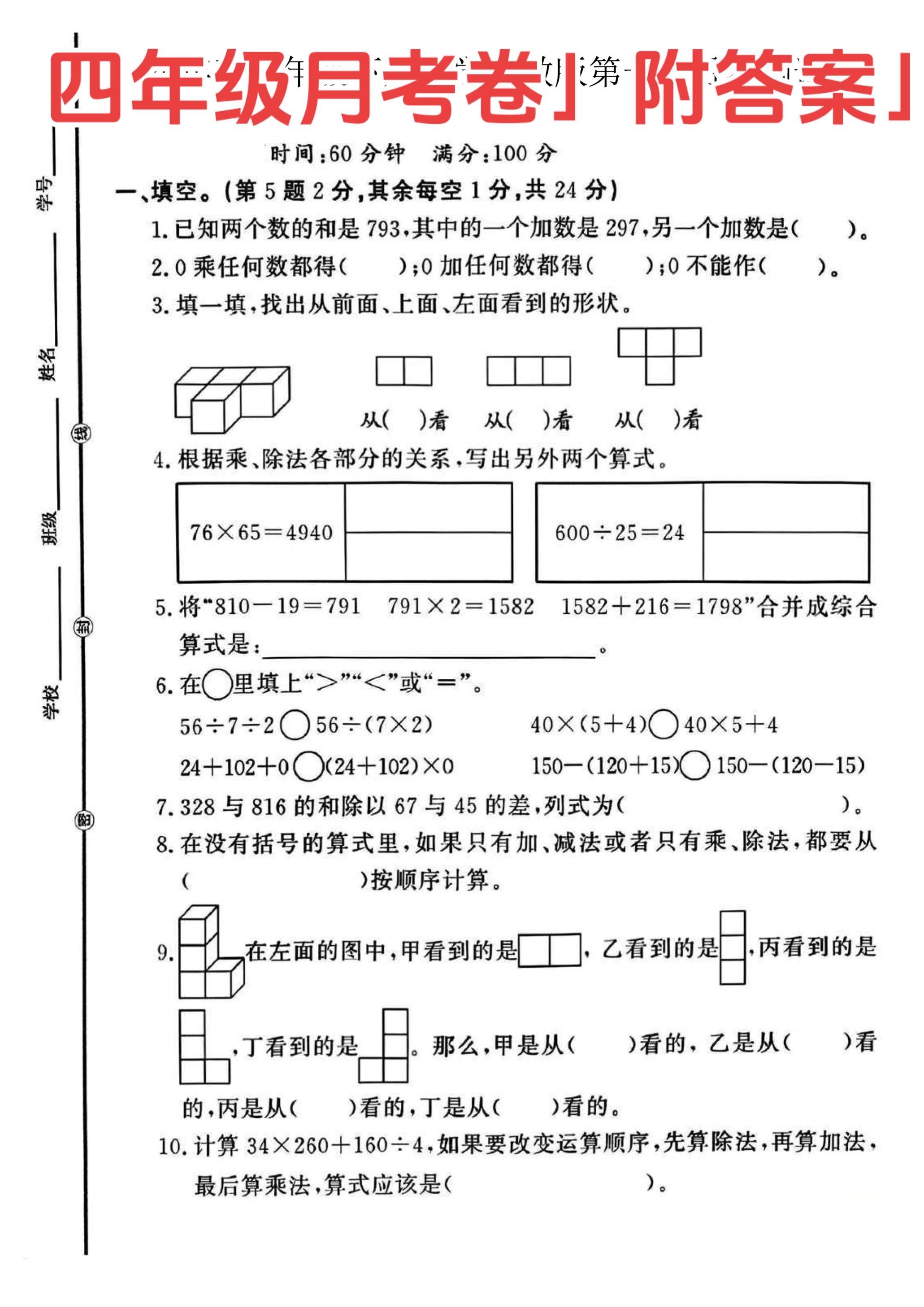 四年级下册数学第一次月考卷|人教版附答案。家有四年级娃的看过来👀 人教版下册数学第一次月考测试卷来啦! 从基础填空到解决问题,全是高频考点 后面还附了完整答案,家长可以直接打印给孩子练 考前刷一遍,查漏补缺超高效✨