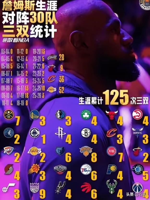 詹姆斯三双大满贯,对阵所有球队都拿到了三双,累计125次排名历史第五位 对阵奇才,詹姆斯拿到21分10篮板12助攻的三双数据,成为NBA历史上年龄最大的三双球员,这也是他职业生涯第125次三双,位居历史三双榜第五位! 同时,詹姆斯也是唯一一位对阵联盟30支球队都拿到三双的球员,对阵国王拿到三双次数最多,有9次;17-18赛季最多,那个赛季一共拿到18次三双;湖人生涯取得的三双数最多,目前已经拿到了52次。 相信詹姆斯的三双次数还会增加,能否超越约翰逊的138次要取决于他什么时候退役。