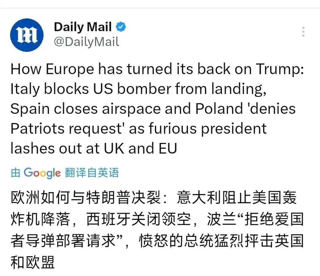 昨晚,《每日邮报》发文写道:“欧洲如何与特朗普决裂:意大利阻止美国轰炸机降落,西班牙关闭领空,波兰‘拒绝爱国者导弹部署请求’,愤怒的总统猛烈抨击英国和欧盟!” [机智]评两句:特朗普这回真被欧洲彻底整破防了!意大利直接拒美军轰炸机降落,理由是"没提前打招呼、不合协议",摆明不陪美国玩火中东;西班牙更绝,全面关闭领空、禁用基地,轰炸机、加油机一律不让过 ;连一向亲美的波兰都硬气回绝,爱国者导弹要守北约东翼,半毛不给中东。 想当年二战欧洲靠美国续命,如今美国一声令下,小弟集体“装聋作哑”。特朗普骂欧盟“扒美国皮”、怼英国“不合作” ,本质是霸权失灵:欧洲不想再当炮灰,怕伊朗报复、怕引火烧身。历史早证明,靠胁迫的联盟最脆弱,如今欧洲集体“反水”,就是给美国单边主义最响耳光,所谓盟友,从来都是利益优先,没人愿当霸权垫脚石!