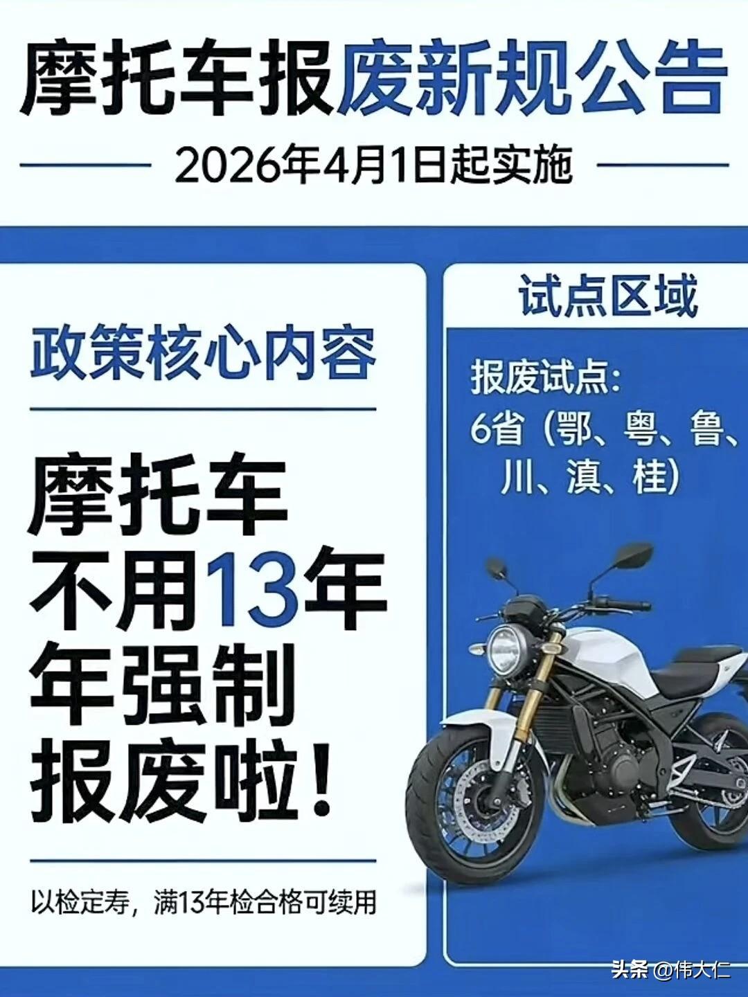 同志们注意啦!你的爱车不用13年强制报废了! 2026年摩托车报废新规中“以检代废”试点将于2026年4月1日起在部分省份正式实施。根据相关信息,试点区域包括湖北、广东、山东、四川、云南、广西等六省。在试点政策下,非营运普通两轮或三轮摩托车使用满13年后,不再强制报废,只要通过专项检验(如52项检查)、安装北斗定位、连续缴纳交强险,并且近三年无重大交通事故、严重违法或非法改装记录,即可继续使用,之后每年需进行一次检验。 该政策目前为区域性试点,尚未在全国范围内推行。而自2027年1月1日起,将正式实施新的《道路机动车辆生产企业准入审查要求》,对摩托车生产端提出更高标准,但此为生产准入政策,非报废管理新规。