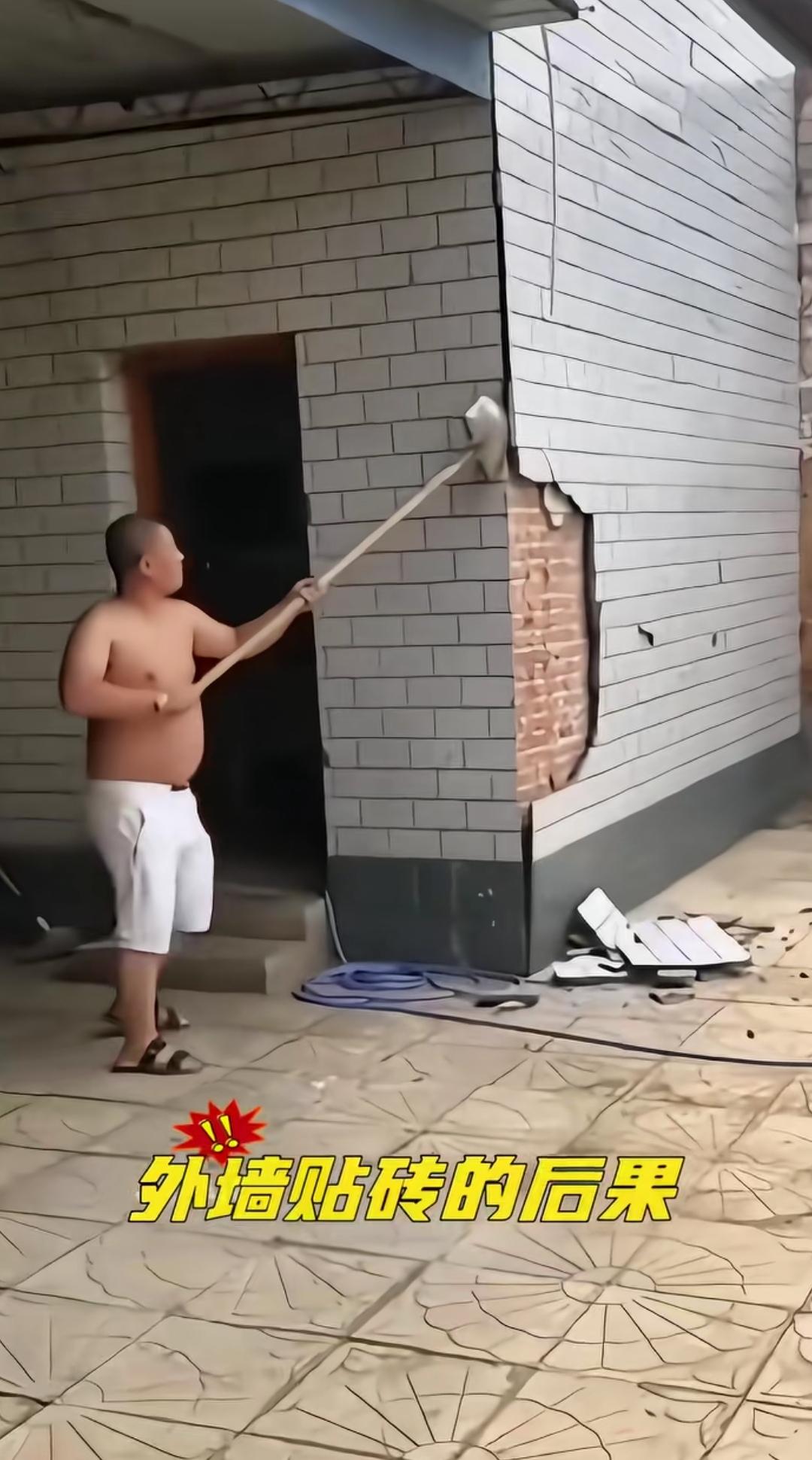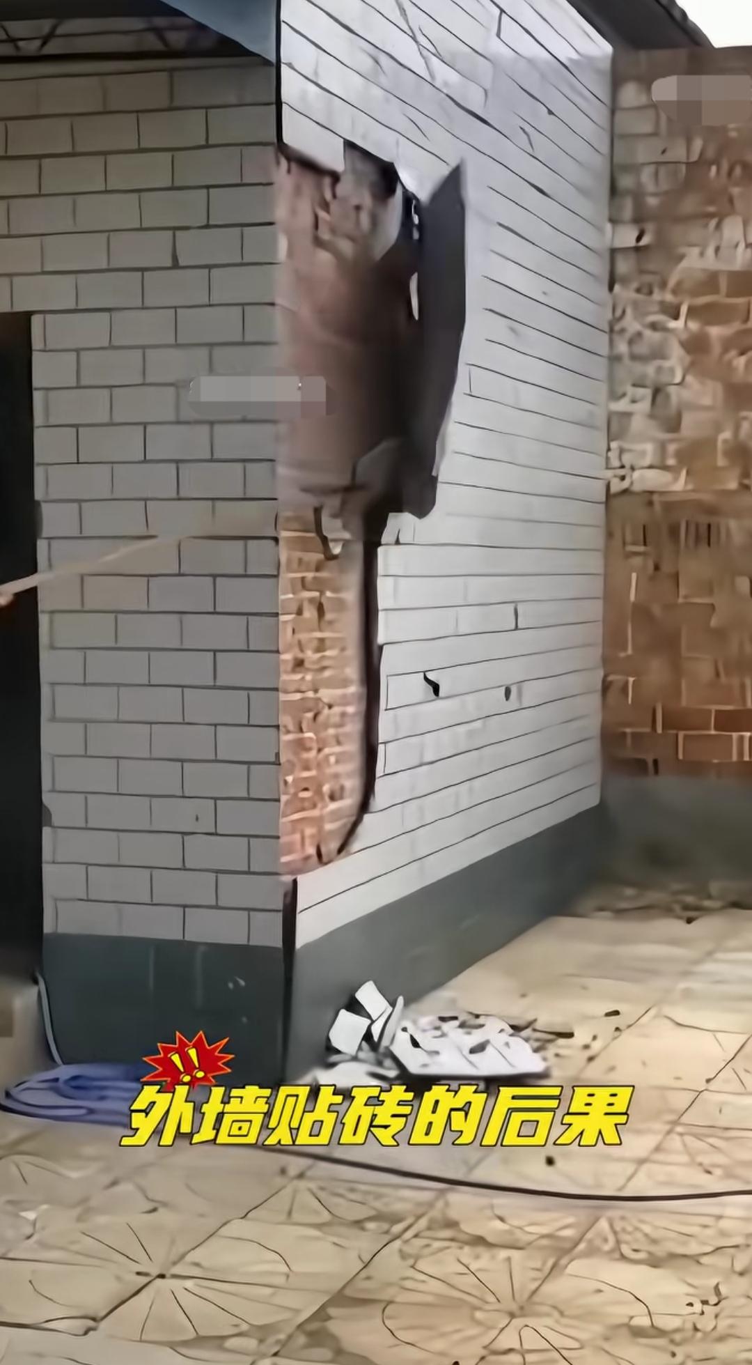 这样的外墙贴砖也太糟糕了!外墙上的瓷片都鼓起来,快要脱离墙面了,轻轻一扒,一大片就掉下来。要是有人刚好在墙边,那可就麻烦了,实在太可怕了! 瞧瞧画面里的场景,一名男子正用铁锹撬外墙上贴的瓷片,墙上连成一片的瓷砖瞬间大片大片地掉落。从画面能看出,外墙贴砖面和砖墙已经完全分离。很明显,外墙上抹的水泥砂浆质量不合格(或者外墙根本没抹砂浆)。由于红砖内部结构本就不够坚固,时间久了,经过阳光暴晒(或者遭受雨水侵蚀),贴砖和红砖之间就容易产生隔层,整面墙脱落只是时间问题。 过去的房子,外墙贴砖脱落的现象很常见,现在的房子很少有这种外墙贴砖了。 在此,我想问问大家,你们见过外墙上的瓷片一撬就一大片掉落的情况吗? 外墙空鼓坠落 外墙外墙面脱落
