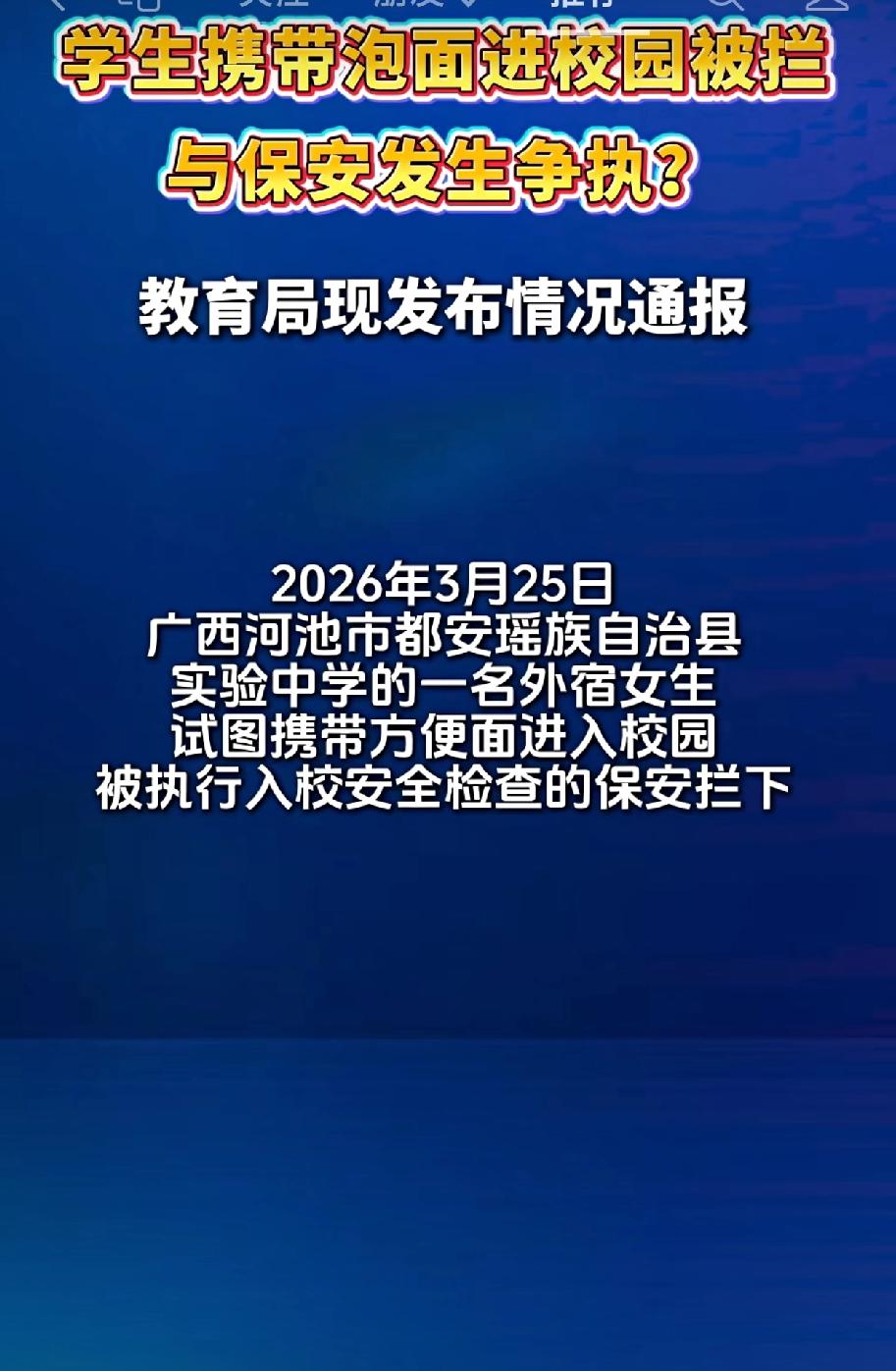 广西河池学生带泡面入校被拦:别让校园管理,丢了育人初心! 最近广西河池都安实验中学的一件事,彻底戳中了网友们的怒火:3月26日前后,一名外宿学生想带泡面进学校,竟被保安死死拦住,甚至用仪器扫描检查,学生卑微恳求也无济于事,此事一经曝光,全网骂声一片。 校方随后通报称,是依据学校管理规定,为了保障学生饮食安全、培养健康饮食习惯才劝阻,还说只是沟通产生误会。可这份通报,非但没平息争议,反而让更多人质疑:这哪里是为学生好,分明是把利益放在人前,把育人初心抛在了脑后。 网友们的指责一针见血:学校本该是教书育人、以人为本的地方,如今却变成了“为钱服务”,死死盯着食堂的利益,生怕学生自带泡面影响食堂生意,才定下如此不近人情的规矩。 泡面本身不是洪水猛兽,学生带泡面入校,或许是食堂饭菜不合口味、价格不合适,或许是孩子单纯想吃一口自己喜欢的食物。学校不从根源优化食堂服务、倾听学生需求,反而用强硬手段禁止自带食物,把保安当成“利益守门员”,这种管理方式,完全本末倒置。 教育的核心是“育人”,不是“逐利”。学校的每一项规定,都该围绕学生的需求和感受出发,而不是围着利益转。保障学生饮食安全没错,但不能用“为你好”当借口,行维护利益之实;规范校园管理没错,但不能冰冷刻板,丝毫不顾学生的尊严和诉求。 河池这所学校的问题,从来不是一包泡面,而是管理理念的错位。想要真正解决争议,从来不是死守规定、强硬阻拦,而是摆正心态:把学生放在中心,把服务落在实处。 优化食堂的菜品和价格,让学生愿意吃、吃得好;多倾听学生的心声,制定人性化的校规,而不是用冰冷的规则压制孩子的合理需求。唯有放弃利益至上的思维,回归以人为本的教育本质,才能赢回家长和学生的信任,才配得上“校园”二字。 别让利益寒了人心,别让管理忘了初心,这才是河池校方最该补上的一课!