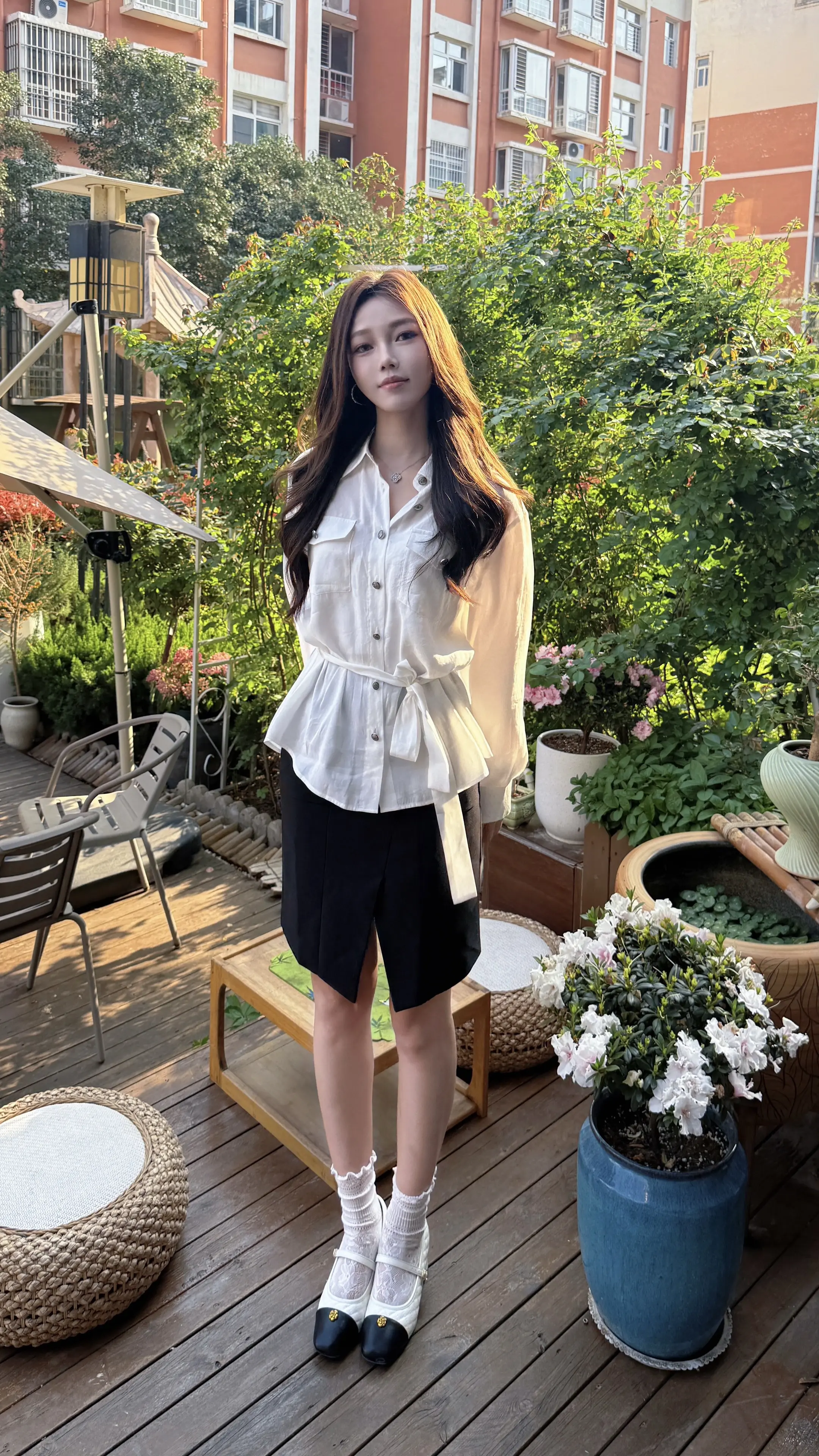 从房子走出去站在春天中间。