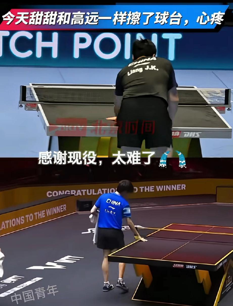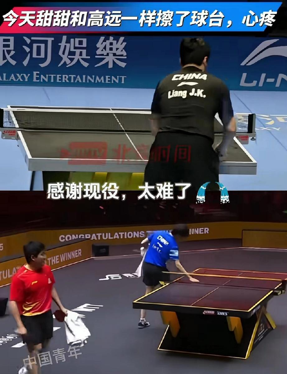 梁甜甜和高远一样低头耐心擦球台,那背影是倔强和不舍的。 梁靖崑真是国乒的靖王爷,一直卖力输出,他们把童年和青春都献给了国家。拼尽全力为国争光。 高远,大胖都曾有高光时光,无奈年龄和伤病,多些包容!都是国家的英雄,祝福他们!感谢现役,感谢他们为国家的付出,希望以后平安、健康!