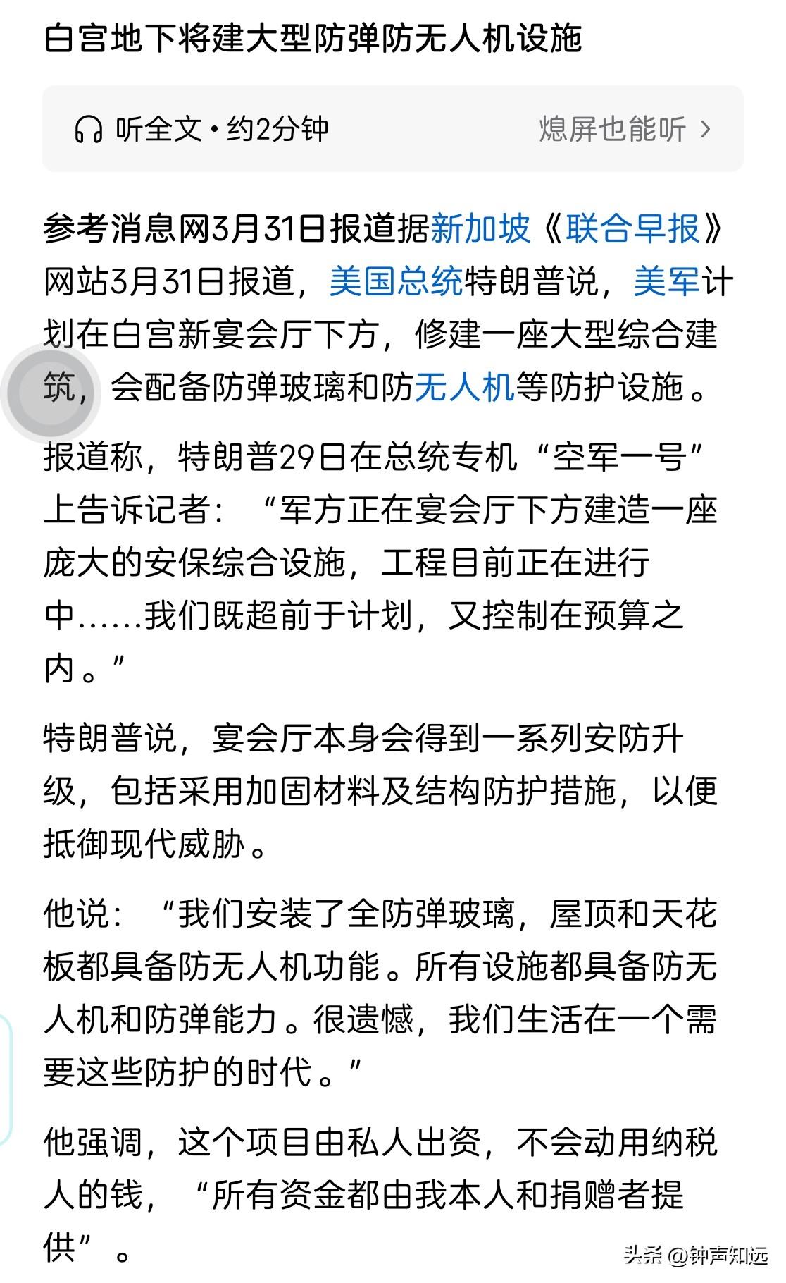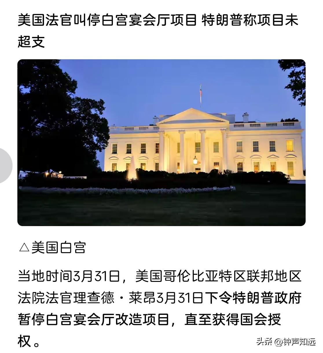 特朗普装修白宫的梦想要泡汤了!法官说总统只是【管家】不是主人。 3月31日美法官叫停了特朗普的白宫装修工程,其实这不是改个宴会厅那么简单。 特朗普明着要翻新东翼宴会厅,暗地里却在其正下方升级总统地下地堡,还是核战级别的紧急指挥掩体,工程预算飙到4亿美元。 法官的核心理由是,总统只是白宫【管家】不是主人,这工程绕开国会审批,也没做历史保护审查,属于程序违法。法院临时禁令停工14天。 特朗普嘴上说花的是私人捐赠,不用纳税人的钱,可资金来源全程不透明,再加上东翼是百年历史建筑,拆建本身就遭文物界强烈反对。 明修栈道暗度陈仓搞地堡升级,如今被法官一刀叫停,特朗普“金碧辉煌”的梦想要泡汤了。