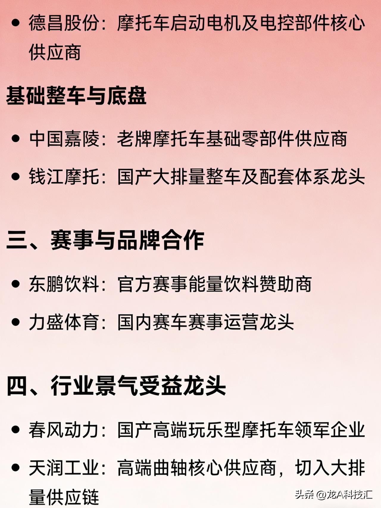张雪机车概念相关企业的龙头全汇总 一、资本关联 宏昌科技:唯一间接参股张雪机车的企业 浙能电力、巨化股份:通过创投平台间接持股(非主业关联) 二、核心零部件与技术合作 动力系统 隆鑫通用:大排量水冷发动机核心供应商 宗申动力:摩托车发动机行业龙头 电控与智能网联 鸿泉技术:两轮车智能网联与电控系统战略合作伙伴 科博达:摩托车电子控制系统龙头 传动系统 征和工业:高性能摩托车链条官方技术合作伙伴 久祺股份:全球摩托车传动部件龙头 轻量化结构件 长盈精密:高端铝合金轻量化结构件核心供应商 热管理系统 银轮股份:摩托车高性能散热系统龙头 空气滤清系统 恒勃股份:摩托车空滤器龙头企业 电机与执行部件 德昌股份:摩托车启动电机及电控部件核心供应商 基础整车与底盘 中国嘉陵:老牌摩托车基础零部件供应商 钱江摩托:国产大排量整车及配套体系龙头 三、赛事与品牌合作 东鹏饮料:官方赛事能量饮料赞助商 力盛体育:国内赛车赛事运营龙头 四、行业景气受益龙头 春风动力:国产高端玩乐型摩托车领军企业 天润工业:高端曲轴核心供应商,切入大排量供应链 免责声明:发文涉及资讯图等内容来自网络公共信息。仅供参考,不构成投资建议。