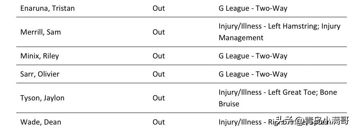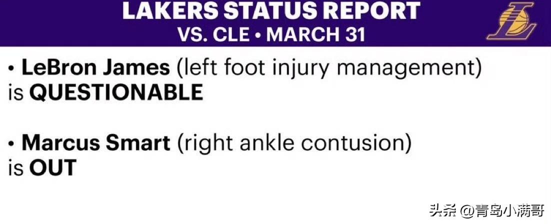 斯玛特不打了!!!骑士vs湖人伤病报告更新,大战一触即发! 骑士今天客场挑战洛杉矶湖人队的比赛将在今天上午正式打响,对于骑士来说这是他们常规赛最后阶段的最重要的一场比赛,因为湖人是他们接下来对手中排名最高的球队。 打完本场比赛后,他们接下来的对手分别是勇士、步行者、灰熊、两次打老鹰、奇才,基本上没什么难度。 上午双方的伤病报告再次更新,湖人方面詹姆斯因左脚伤病管理,状态为出战成疑,预计可以打的,而斯玛特因为右脚踝挫伤将继续缺阵。 骑士伤病名单中有6人无法出战,除了泰森和韦德以外的主力球员都可以打,和我们预测的也是一致的。 大战一触即发,双方球员背靠背比赛都比较辛苦,看复出的东契奇能否大杀四方,哈登和米切尔的双后场组合能否击溃东契奇和里夫斯的后场组合。湖人 东契奇 詹姆斯 哈登