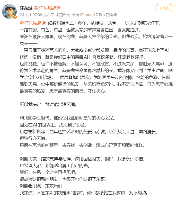 汪东城愚人节宣布退出娱乐圈!4月1日一大早,汪东城发文宣布暂时退出娱乐圈。至