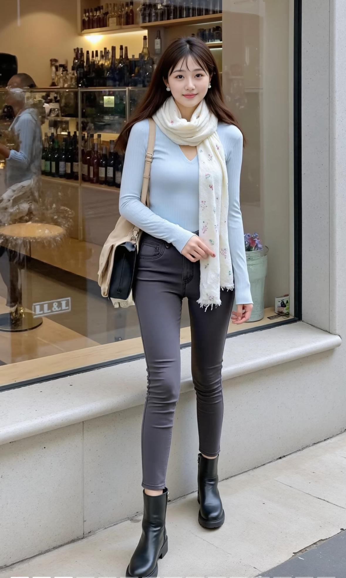 温柔蓝调毛衣+灰色紧身裤,搭配米色围巾,简约时尚,温暖舒适!
