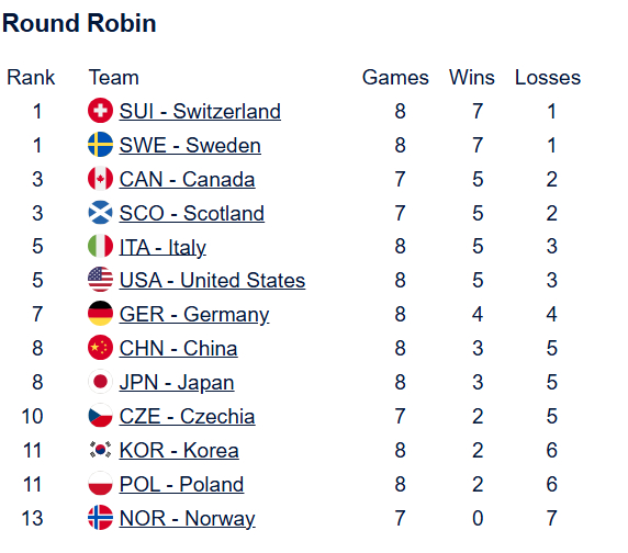 冰壶 实时排名,中国队3胜5负已经掉到第八
