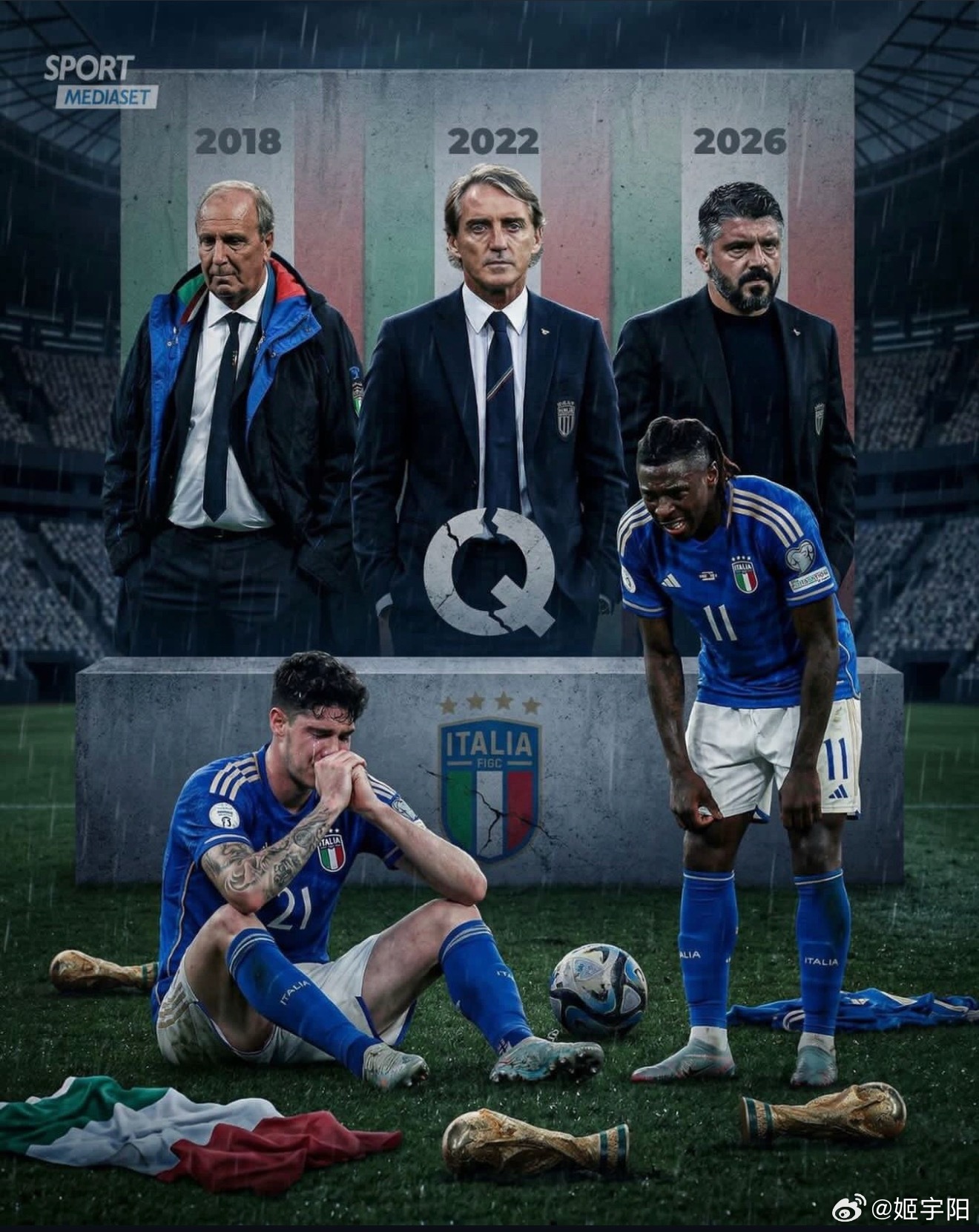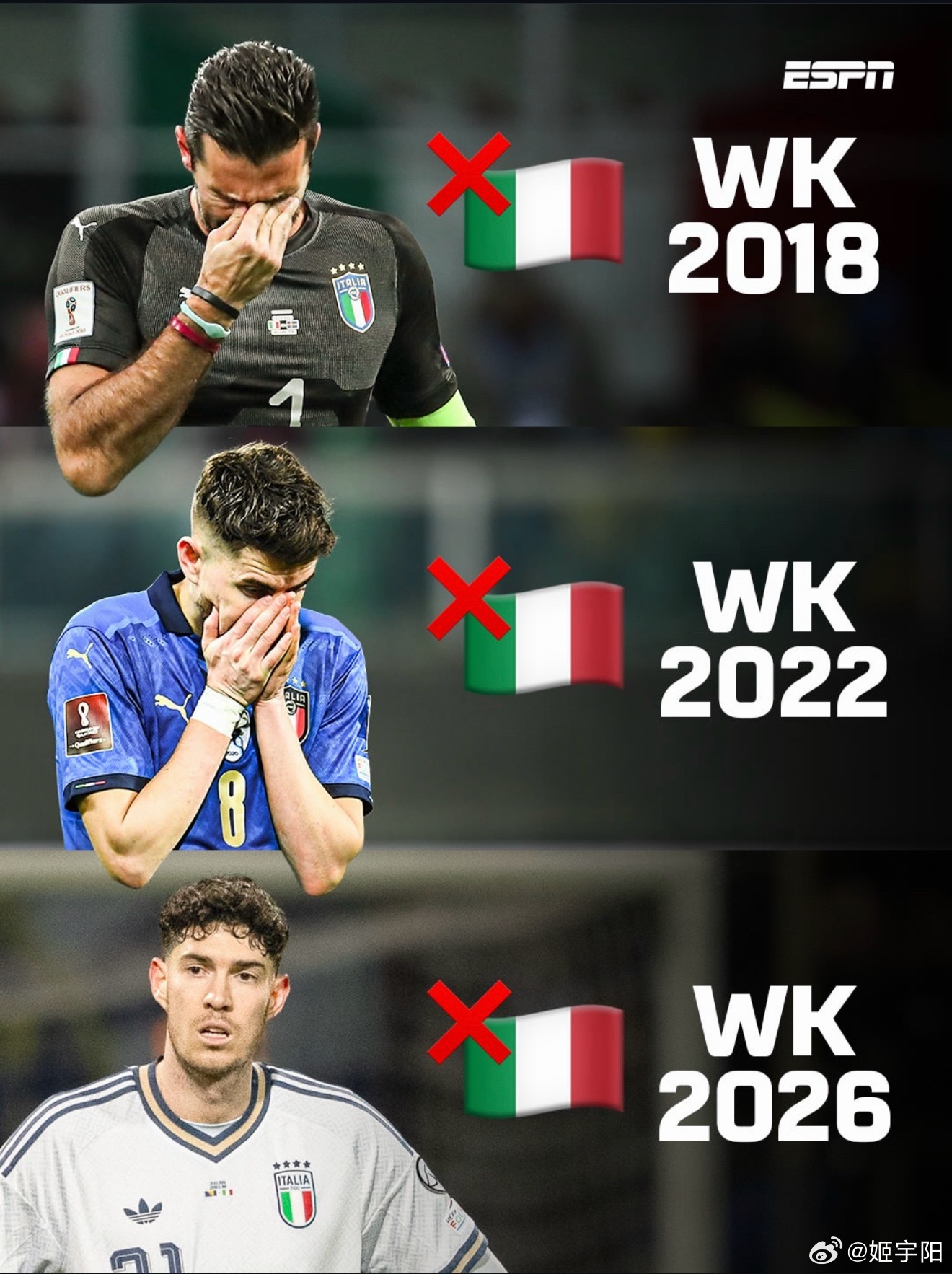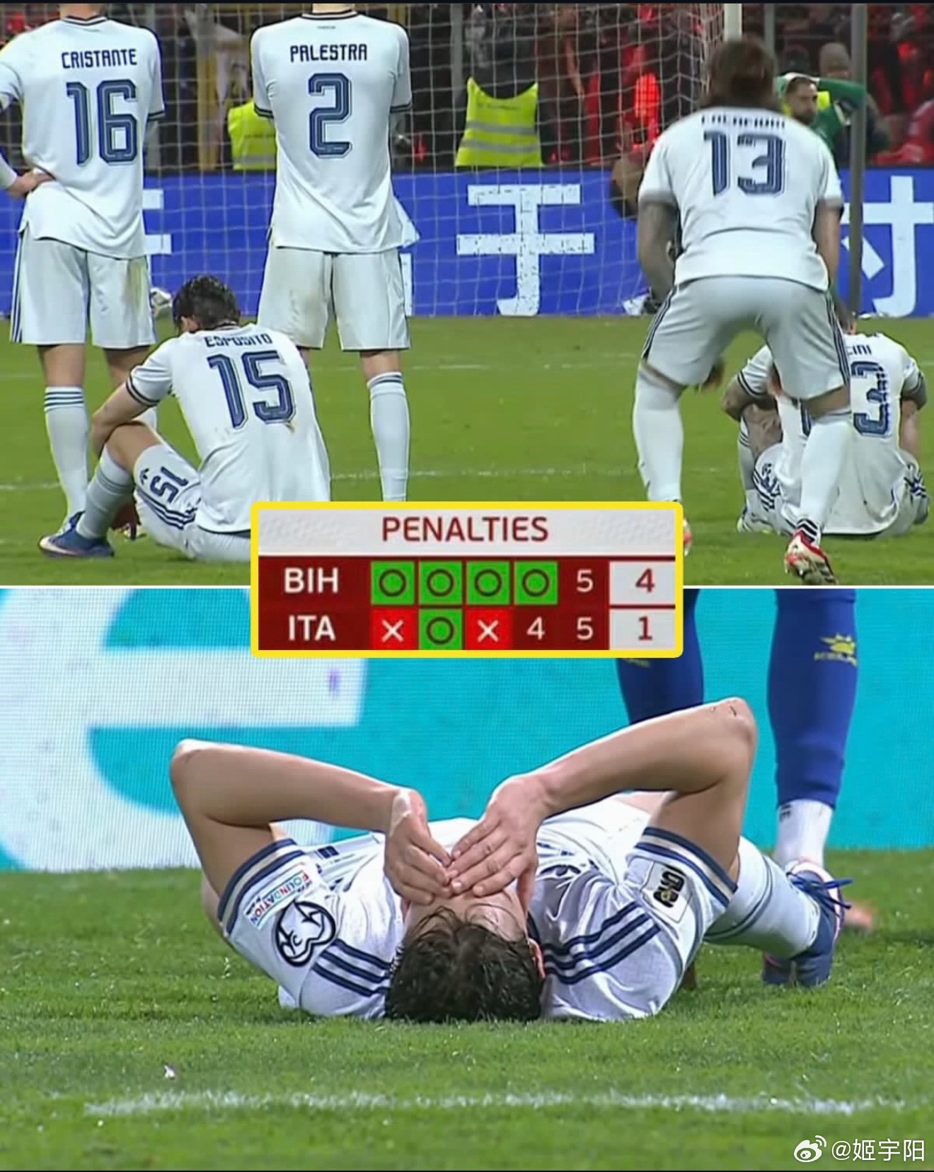 波黑vs意大利意大利连续三届无缘世界杯决赛圈,冤吗?主裁判是欧洲名哨蒂尔潘,那张直红确实也是最后一名防守球员的犯规。整场比赛,波黑射门30次,意大利9次;射正波黑11次,意大利3次;角球也是 10 比 4。意大利全面被动的一场比赛。到了点球大战,多纳鲁马虽然一个没扑出,但之前他的全场扑救已经达到 10 次之多。意大利自己第一个点球就打飞了。连续第三次无缘世界杯决赛圈,欧洲区预选赛确实竞争激烈,但意大利足球说到底,还是自身实力在下降退步。意大利无缘世界杯
