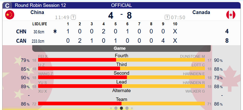 冰壶 昨晚对阵加拿大4-8败北,第九局丢4太可惜了