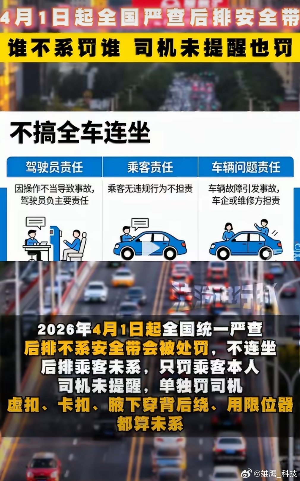 4月1日起全国严查后排安全带司机未提醒后排系安全带也将被罚 为了乘客安全。4月1日起,全国将统一严格执法后排乘客未系安全带行为,注意⚠️司机未履行提醒义务也将被罚。
