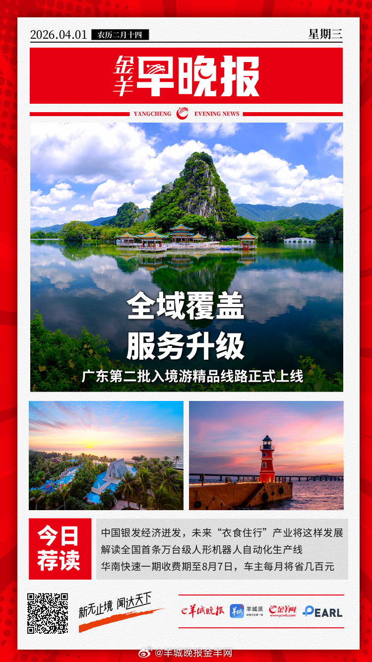 #金羊早晚报# 广东雨水仅“休息”两天,预计清明前再次“雨纷纷”;中国银发经济活力迸发,未来“衣食住行”产业将这样发展;“30分钟下线一台机器人”如何实现?解读全国首条万台级人形机器人自动化生产线;两大头部企业直播版权诉讼和解!索赔7000万元变三年合作;“腿都吓软了”!脚下就是悬崖,导航还让直行;预计年底通车!清花高速广州段主线贯通;华南快速一期收费期至8月7日,车主:免费通行后每月将省几百元;广东第二批入境游精品线路正式上线;#张雪称影视版权给顶级团队# 张雪机车一战封神,浙江资本赢了,东鹏特饮押宝也赢麻了;一上午涨超400亿!美的集团抛出最高130亿元回购计划后;茅台时隔八年自营零售价上涨:突破1500元,白酒板块应声大涨;“李白之争”不能“又能怎”:维权目的是让规则被看见、被遵守;阳江“龙虾球王”梁家俊的双面人生:从百亩虾塘到粤BA赛场;日本首次部署具备“对敌基地攻击能力”远程导弹;部分海湾国家被曝“私下”推动美国发动地面战。#4月1日起全国严查后排未系安全带##意大利连续3届无缘世界杯##4岁女孩独自买汉堡遭陌生女子踢踹##俄罗斯运输机坠毁29人遇难# 更多精彩报道,请扫码关注羊晚全媒体报道!