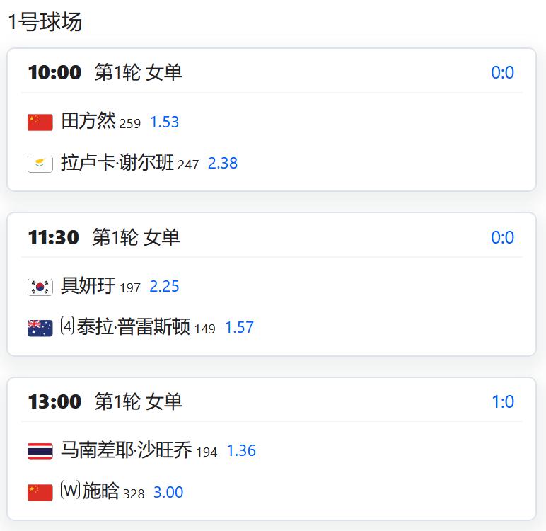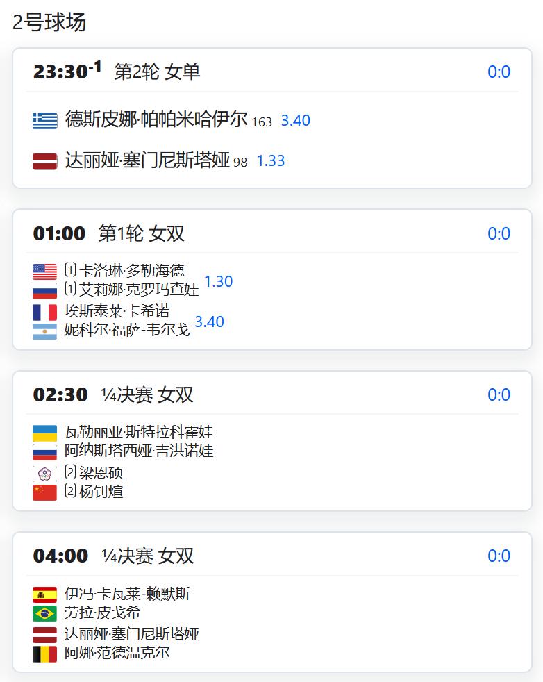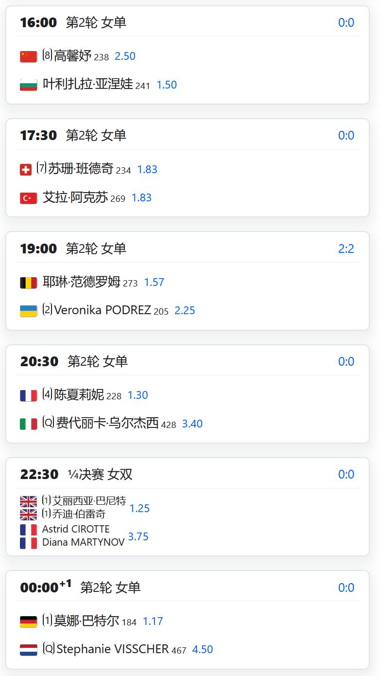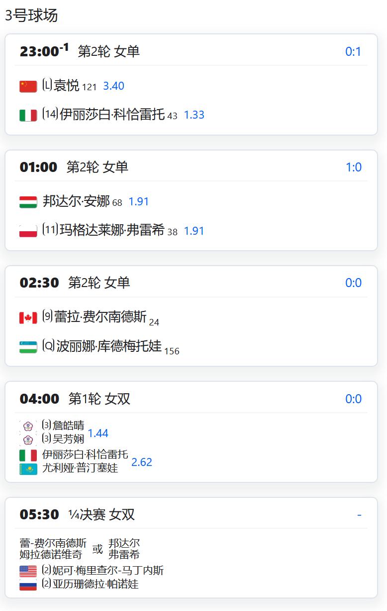 赛果: WTA500赛查尔斯顿站,女单第一轮,张帅3-6,0-6不敌斯塔罗杜布采娃,无缘晋级;随后女双第一轮,搭档克鲁尼奇以7-6(3),7-5战胜印尼组合苏加迪/曾丽美,晋级; 幸运落败者袁悦救赛点双抢七逆转谢里芙,晋级女单第二轮; WTA250赛波哥大站,女双第一轮,杨钊煊/梁恩硕抢十逆转对手,晋级女双八强。 赛程: WTA500赛查尔斯顿站,袁悦将在第二轮对阵14号种子科恰雷托; ATP250赛休斯顿站,男单第二轮,张之臻将对阵头号种子谢尔顿,比赛时间不早于北京时间4月2日早晨7时; WTA250赛波哥大站,女双四分之一决赛,杨钊煊/梁恩硕将对阵斯特拉科霍娃/吉洪诺娃; W100六安,女单第一轮:朱琳将对阵复出后连续两周夺冠的王曦雨; 马烨欣对阵持外卡出战的任钰菲; 尤晓迪对阵头号种子塔拉鲁德; 田方然对阵谢尔班; 持外卡参赛的施晗对阵沙旺乔; 郭涵煜对阵从资格赛突围的李宗钰; W50宫崎,男双第一轮,孙发京/吴东霖对阵熊坂拓哉/松田康希。