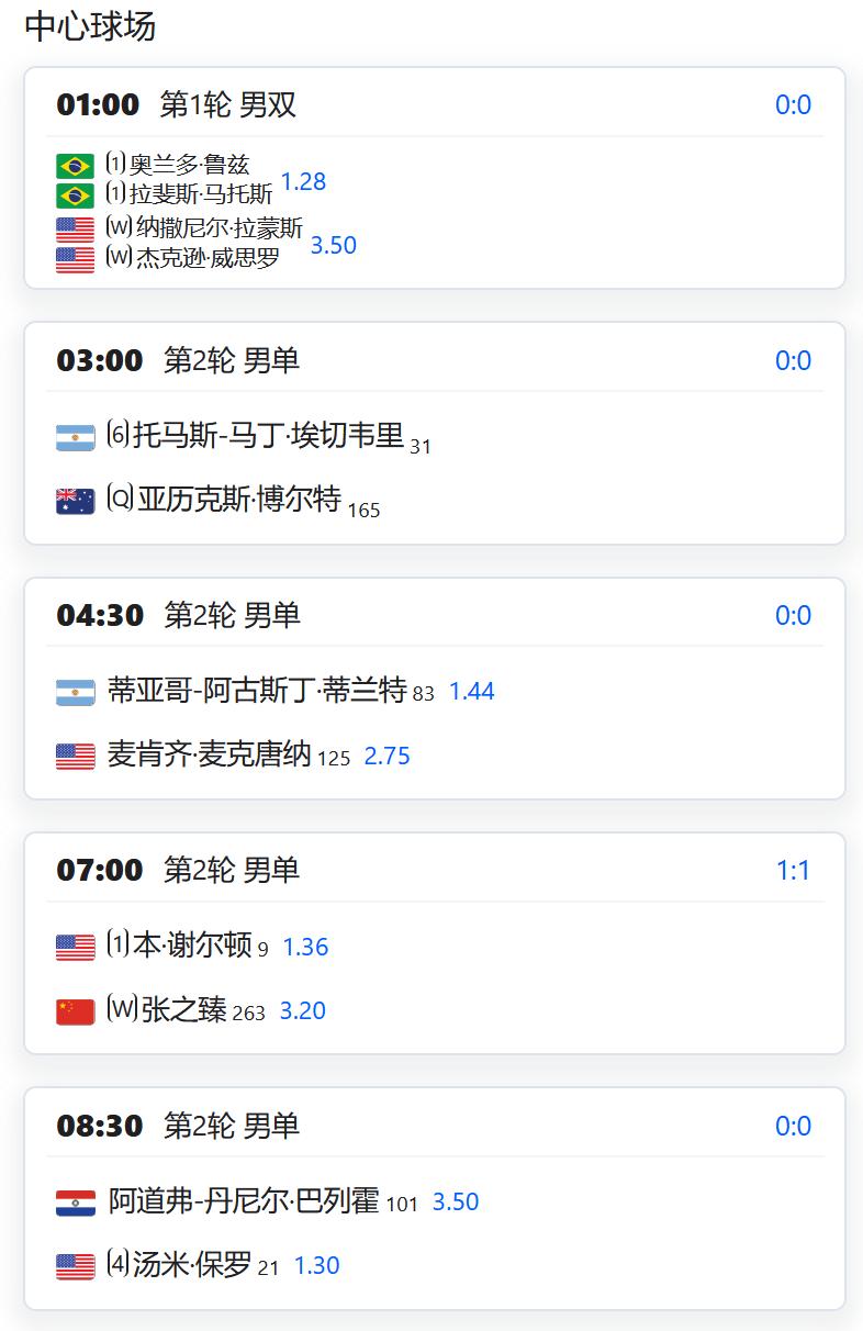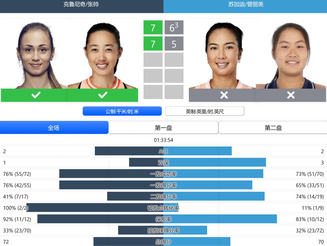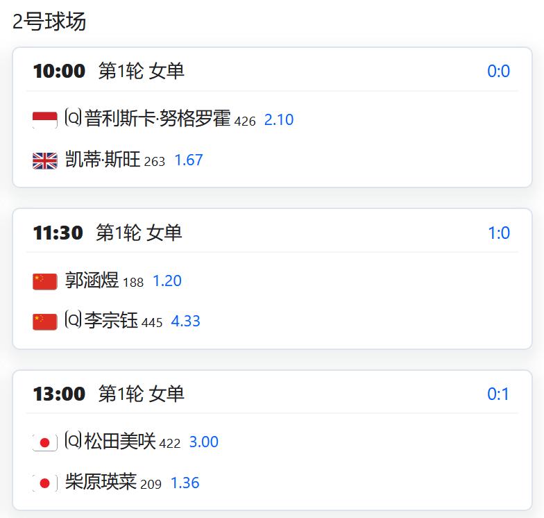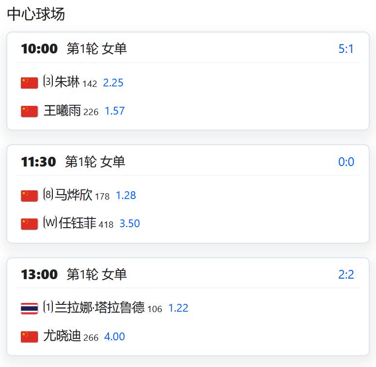 赛果: WTA500赛查尔斯顿站,女单第一轮,张帅3-6,0-6不敌斯塔罗杜布采娃,无缘晋级;随后女双第一轮,搭档克鲁尼奇以7-6(3),7-5战胜印尼组合苏加迪/曾丽美,晋级; 幸运落败者袁悦救赛点双抢七逆转谢里芙,晋级女单第二轮; WTA250赛波哥大站,女双第一轮,杨钊煊/梁恩硕抢十逆转对手,晋级女双八强。 赛程: WTA500赛查尔斯顿站,袁悦将在第二轮对阵14号种子科恰雷托; ATP250赛休斯顿站,男单第二轮,张之臻将对阵头号种子谢尔顿,比赛时间不早于北京时间4月2日早晨7时; WTA250赛波哥大站,女双四分之一决赛,杨钊煊/梁恩硕将对阵斯特拉科霍娃/吉洪诺娃; W100六安,女单第一轮:朱琳将对阵复出后连续两周夺冠的王曦雨; 马烨欣对阵持外卡出战的任钰菲; 尤晓迪对阵头号种子塔拉鲁德; 田方然对阵谢尔班; 持外卡参赛的施晗对阵沙旺乔; 郭涵煜对阵从资格赛突围的李宗钰; W50宫崎,男双第一轮,孙发京/吴东霖对阵熊坂拓哉/松田康希。