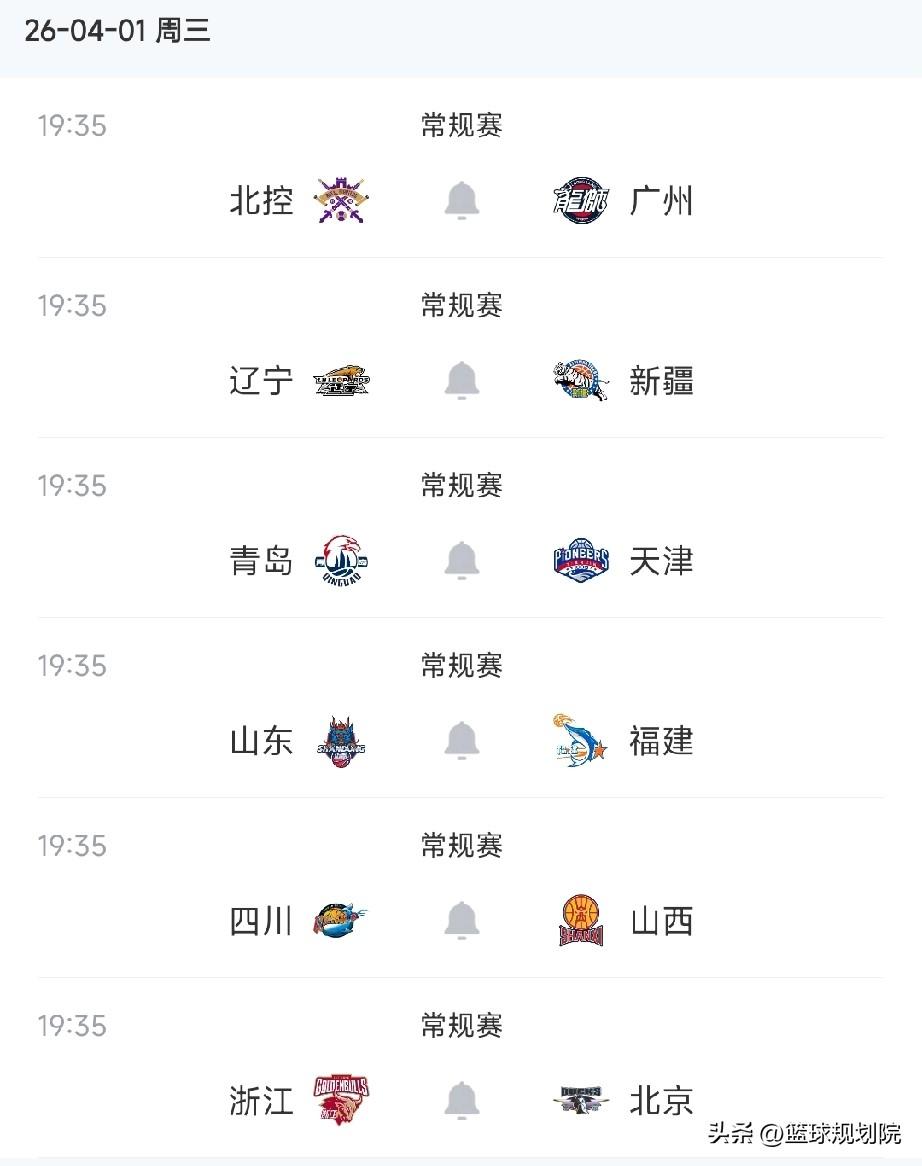 京辽出战!CBA今日赛程安排! 根据最新赛程安排,今日即4月1日共有6场比赛,分别为: 第一场,北控对阵广州 第二场,辽宁对阵新疆 第三场,青岛对阵天津 第四场,山东对阵福建 第五场,四川对阵山西 第六场,浙江对阵北京 推荐比赛,辽宁对阵新疆,浙江对阵北京以及四川对阵山西 辽宁对阵新疆这场比赛,对辽宁男篮来说非常重要也是卡位战,辽宁和宁波战绩相同,需要胜利来巩固自己的排名。 浙江和北京应该算是实力相当,比赛肯定会说相当激烈! 四川对阵山西的比赛,就是看热闹了,四川现在0胜32负,大家都期待谁能成为本赛季第一支爆冷输给四川的球队!