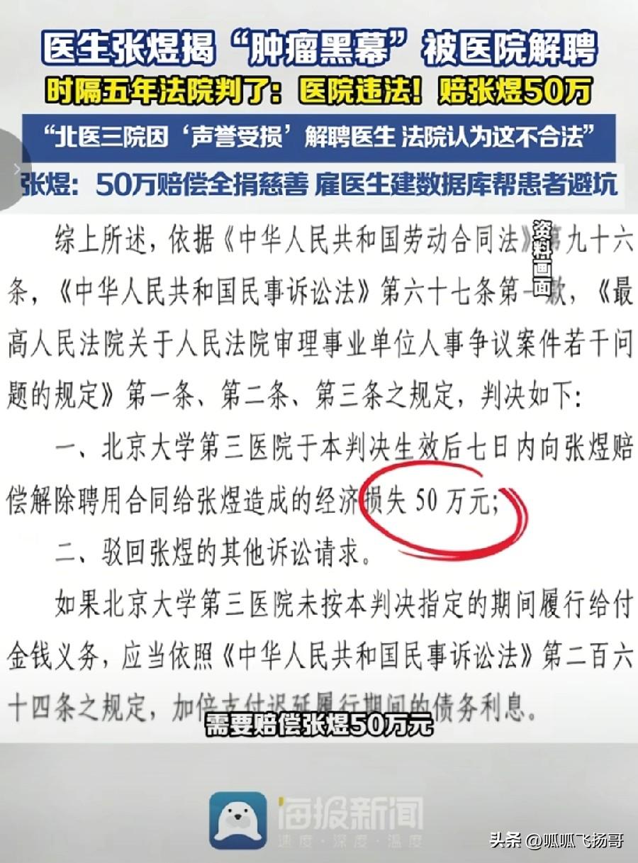 张煜医生又火了! 张煜上次爆火是他因为揭秘肿瘤治疗黑幕被医院开除。 张煜揭露有医生对患者实施过度医疗, 甚至重过度医疗, 无限制把病人的花费升高 , 甚至让他死亡更快的医疗,医生给患者的选择方案不是出于患者利益,是出于自己的利益最大化,这是违背医生底线的,呼吁严重的过度医疗入刑! 这次张煜医生再次爆火是他晒出法院判决书, 法院一审宣判,医院解聘违法,赔偿张煜医生50万 。 张煜表示不会上诉,并计划将赔偿投入到慈善事业中 。 3月31日 , 张煜医生更新视频, 以他医院工作多年的所见所为 , 再次感慨,不管大家是否相信 ,由于医疗领域监督缺乏和同行保护等各种原因,过度治疗和错误治疗等不良医疗行为相当猖獗,主要集中于花费高的领域,有的医生真的会蓄意的把肿瘤患者的花费急剧提高,甚至可能达到10倍以上,已经有不少患者因此人财两空 甚至背上巨额债务这都是惨痛的教训,必须想办法避免 千万注意 别以为花钱多就一定是好的治疗 不良医生是给患者滥用或错用 各种不需要的 昂贵治疗,患者的花费升高了,但甚至死亡率也在提高,这怎么能行?这种行为其实完全违背了医生的基本伦理道德,非常之可耻,医生的使命是保护患者。 最后张煜医生强调,国家已经在不断的下调肿瘤治疗的花费,通常可以不需要动辄十几万 , 几十万甚至更高的花费就能完成肿瘤的治疗,请相信国家 ! 张煜医生为了让社会重视医院对肿瘤治疗的过度医疗, 付出了自己职业生涯的代价 , 令人唏嘘 。 这个社会正因为有张煜这种有良知,有正义,勇敢的人,才让社会多了温暖和阳光。 感谢法院给了张煜公道 !