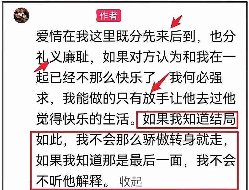 张张在昨天晚上23:04又发了一段话:,爱情在我这里既分先来后到,也分礼义廉耻。如果对方和我在一起已经不那么快乐了,我何必强求呢?我能做的只有放手让他去过他觉得快乐的生活。如果我知道结局如此,我不会那么骄傲转身就走,如果我知道那是最后一面。我一定会听他解释。之前她说她以后不打算结婚了。还把前前男友送她的5斤黄金戴在了头上。去年还晒出来自己做的东北菜以及前前男友给她买的小轿车。在去年的11月份。她用前前男友给她买的黄金以及小房子。换取了他们俩在一起同居三年租住的大房子。张张和前前男友分手后又谈了一个男朋友,又分手了,前男朋友揭发她被包养,说她有很多不明财产,她说是前前男友给的。从此以后她就开始在抖音上发布回忆自己上上一段感情的心路历程。