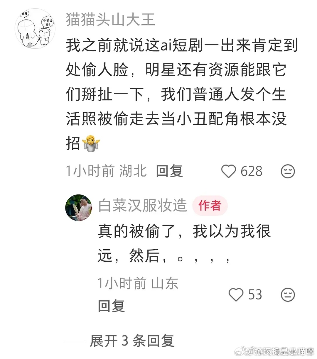 大家以后真的少用自己的脸玩ai特效,有普通人发在网上的照片被红果短剧拿去融脸,生成小丑配角了