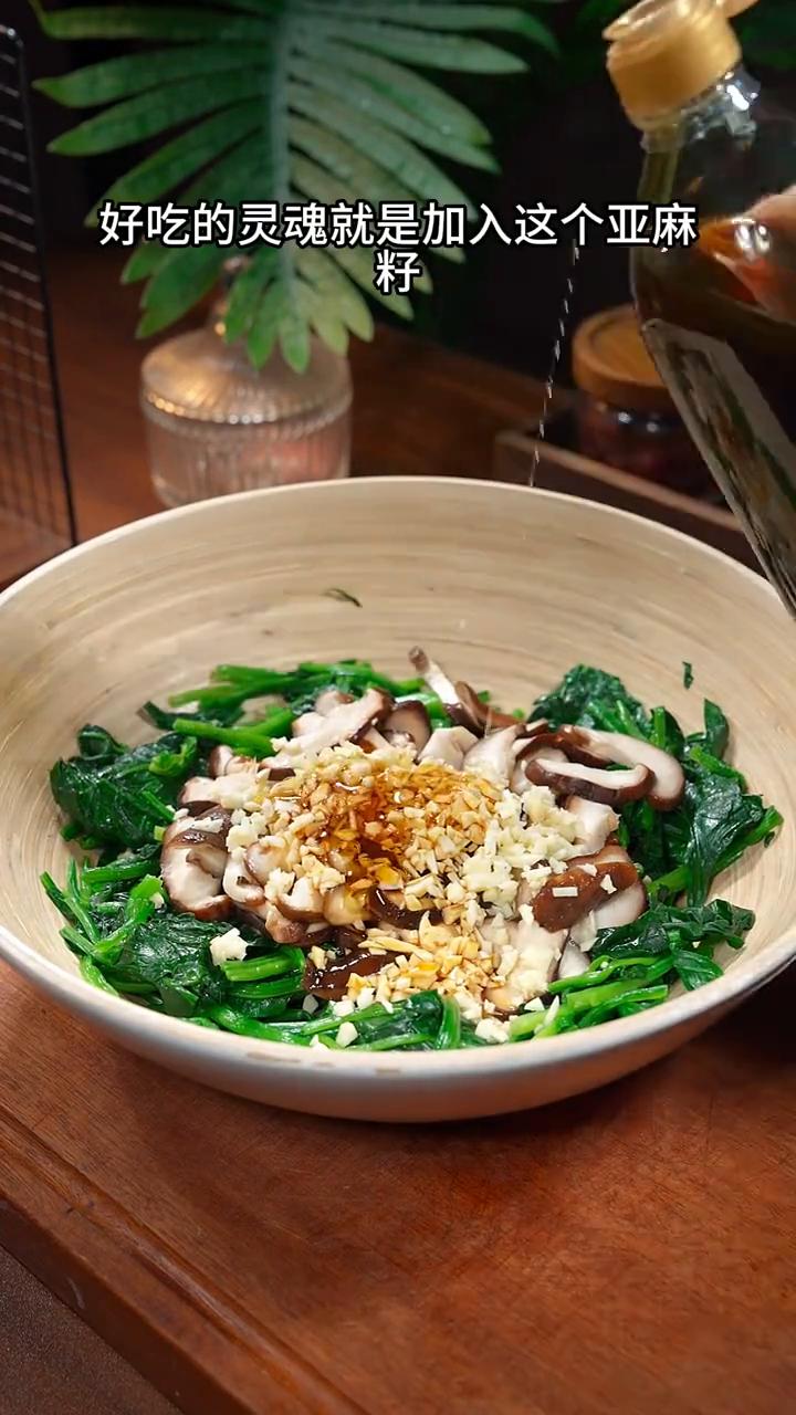 菠菜新吃法。 姐妹们,我告诉你一个秘密,只要把香菇放进菠菜里拌一拌,就能做出一道全网很火的菠菜神仙吃法。楼下西餐厅一份就要99,自己在家做成本只要几块,清脆爽口,好吃又解腻。 ·首先五毛一斤的菠菜改刀切成小段,三毛一斤的蘑菇切成薄片。 ·锅中水开放一勺盐和一勺食用油,这是菠菜翠绿不发黑的关键。 ·焯烫60秒,捞出来沥干水分,收入大盆中。 ·再倒入香菇焯烫熟,捞出沥干水分,倒入菠菜里。 ·然后放蒜末、少许的生抽、一点点香油。 ·好吃的灵魂就是加入亚麻籽芝麻盐,平常喜欢吃轻食水煮菜的家人们可以拍一单试试。它里面有奇亚籽、亚麻籽、白芝麻,还有低钠盐,没有乱七八糟的添加,都是小火慢炒研磨而成。平时用它来做个水煮菜、凉拌菜、各种轻食沙拉,味道都很不错。 ·最后翻拌均匀即可开吃。 您看做法是不是很简单?注重身材管理的姐妹们一定要收藏起来试试。