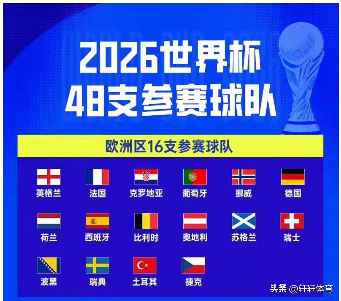 2026年美加墨男足世界杯所有48支参加正赛球队,经过激烈的争夺已经决出47支球队,仅剩的最后一个名额将在伊拉克与玻利维亚的洲际附加赛中产生,仅剩的这个名额的比赛将在北京时间4月1日也就是今天的11点开始,看了一下晋级的球队,有很多曾经的各大洲劲旅,没有出现在本届世界杯的名单中,下面就来盘点一下曾经的强队本届没能出线的球队以及首次进军正赛阶段的球队: 曾经的强队本届世界杯没能晋级正赛的球队; 1、曾经夺得4届世界杯冠军的意大利队,同时球队已经连续三届无缘世界杯正赛阶段的比赛了,今天凌晨结束的附加赛中意大利点球不敌波黑队,遗憾出局。 2、丹麦队2020年的欧洲杯冠军,附加赛点球不敌捷克,无缘世界杯正赛。 3、波兰莱万领衔,附加赛不敌瑞典被淘汰,37岁的莱万就此结束了自己的世界杯之梦。 4、塞尔维亚小组赛直接出局,也是曾经的强队最落寞的代表球队。 5、非洲雄鹰尼日利亚,预选赛点球不敌民主刚果,直接被淘汰。 6、刚刚与国足进行了友谊赛的喀麦隆队,喀麦隆也是非洲参加世界杯最多的球队,本届未能晋级正赛,这也是喀麦隆连续的两届无缘正赛了。 7、智利连续三届无缘世界杯。 8、哥斯达黎加连续两届无缘世界杯。 首次进军世界杯正赛的球队; 1、乌兹别克斯坦中亚首支进军世界杯正赛的球队。 2、约旦2024年亚洲杯亚军后首次创历史晋级世界杯正赛阶段比赛。 3、佛得角人口只有约53万的国家。 4、库拉索刚刚热身赛被中国队2-0击败的世界杯新军。 你还记得那几支你曾经喜欢过的球队,没有能够晋级世界杯正赛的遗憾,那支新军让你非常意外,欢迎评论区讨论。