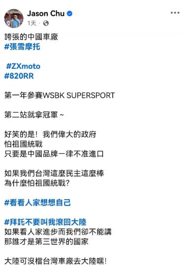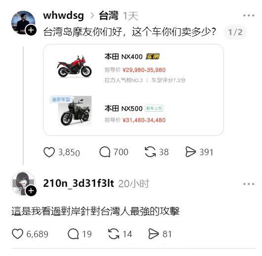 原来台湾省的机车也这么贵? 博主早知道台湾省汽车价格很高,大约是大陆的两倍到三倍以上,甚至更贵。没想到机车也是贵两三倍以上,确实之前没想到。本田飞度汽车在大陆七八万人民币,在台湾省被卖到近二十万人民币一台,配置还是差不多的情况下,差距十分惊人。大众polo在台湾省的售价超20万人民币,网红台湾表妹亲口说的,而大陆只有8万左右人民币。 机车版的幼兽C110,日本和美国卖1.88万(人民币),中国大陆卖1.3万人民币,台湾省卖4.2万人民币,黑色熊本版卖4.5万人民币,确实贵了好多。 有些话台湾同胞说得不错,大陆很多东西都是靠拷贝起步,但是后面加上一些创新,就超过国外品牌了。比如电车、家电、造船、造车等行业,都是青出于蓝而胜于蓝。 台湾省摩托车保有率极高,很羡慕大陆电动和加油摩托车,卖得很便宜。因为台湾省限制进口大陆的电动车和摩托车,不仅数量少,而且卖得超级贵,充电也不方便。所以摩托车使用如此广泛,引起的关注度自然很高。 当然的现实,就是要全力的发展制造业,尤其是高端制造业,也是一步步起来的。在机车方面,咱们并不落后太多,在全力追赶。电动摩托车更是全球领先,只要用到电的各种机械,咱们国内的水平都很高,这个可能是民族天赋。 台湾省网友挺羡慕大陆的汽车和摩托车便宜,这个是发自肺腑的事实。