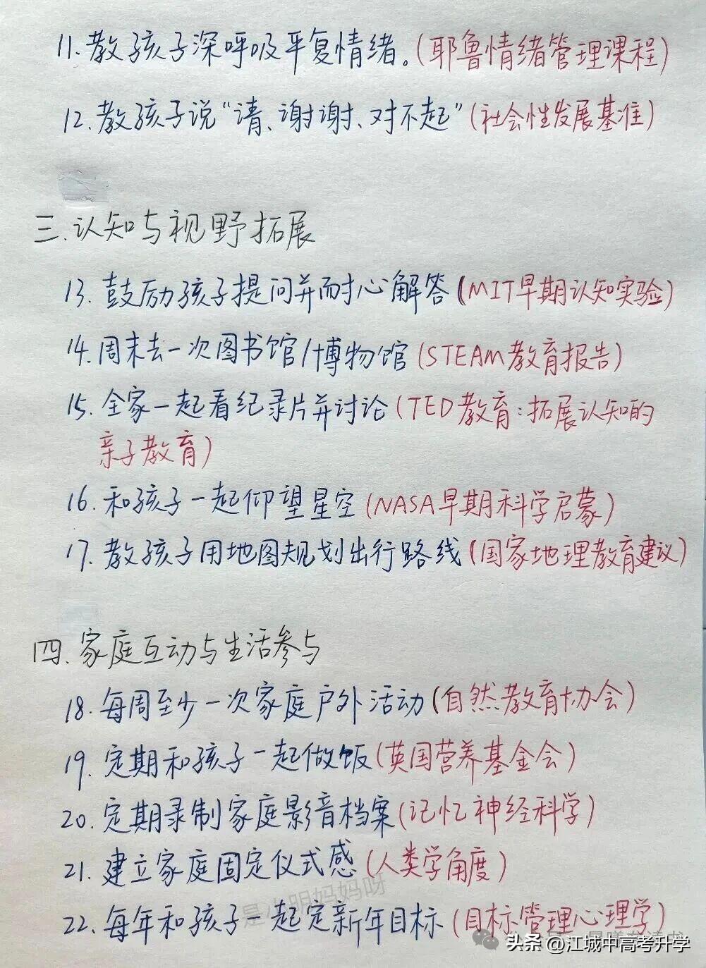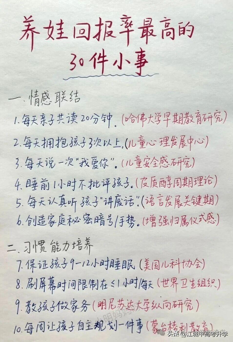 养娃回报率最高的30件小事 养娃不是一朝一夕的事情, 在孩子成长的过程中总会碰到这样那样的问题, 如今的孩子普遍存在的问题, 就是信念感、目标感缺失的问题, 不知道为什么要学习, 不是为自己而学习, 都是为父母、为家长在学习。 如今孩子为什么抑郁的风险那么高, 没有目标、没有信仰、没有敬畏, 都活在自己的世界里, 就如同没有根的浮萍,随波逐流 都在不断的消耗着自己的能量。 养孩子最重要是养心态, 自己的心稳,孩子的心才能定, 要培养孩子能面对未来一切困难的勇气, 才是王道,至于成绩,那只是锦上添花。