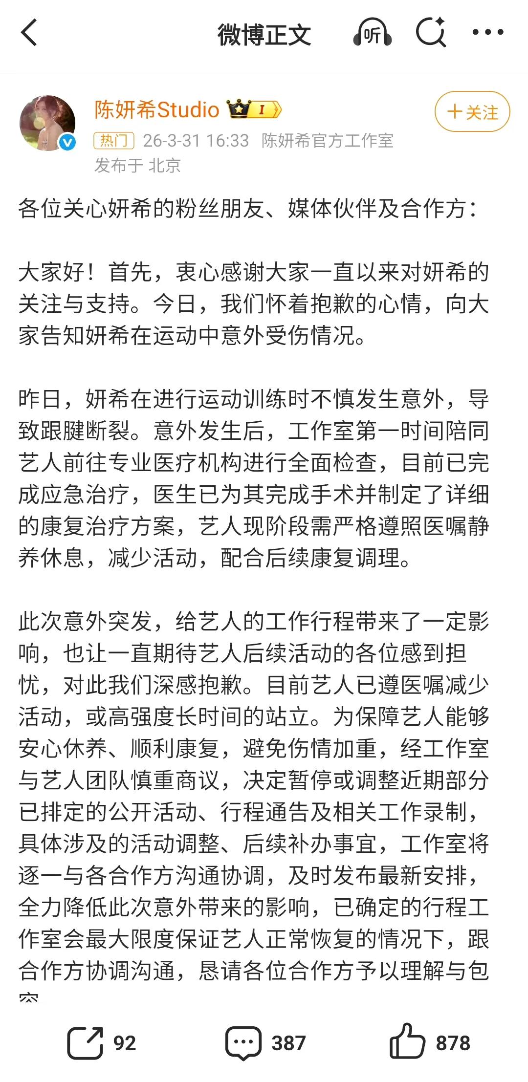 陈妍希运动意外跟腱断裂,本人发文报平安让人心疼! 4月1日,陈妍希突然冲上热搜,原因竟是运动时发生意外,导致跟腱断裂! 据她本人社交平台透露,当时正在做跳跃动作,落地瞬间听到“啪”一声,随即剧痛倒地。紧急送医后被诊断为跟腱断裂,目前已接受手术治疗。她在文中写道:“虽然是个意外,但会好好康复,请大家放心。”字里行间透着坚强,但粉丝们看了直呼心疼!运动安全真不是小事,祝愿“小龙女”早日康复重返舞台!陈妍希运动时发生意外致跟腱断裂 陈妍希 跟腱伤势