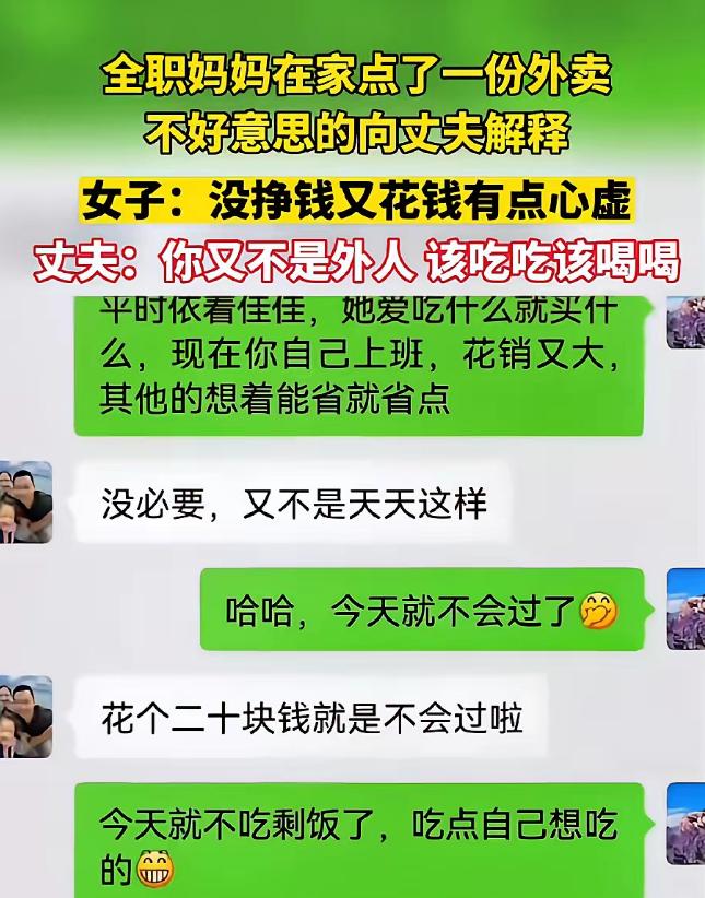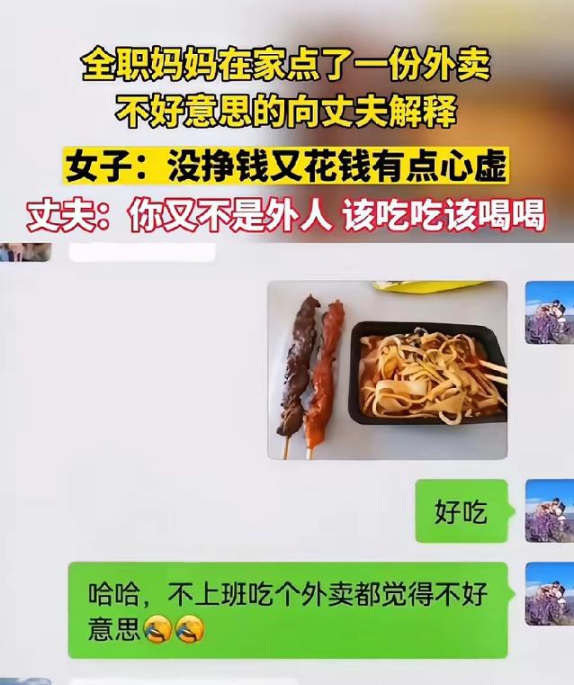 这或许是夫妻相处最佳模式了,女子分享了自己在家做全职妈妈,没有收入,全靠丈夫供养。有一次做完家务过了饭点,女子就给自己点了一份外卖,但点完后又有点怕丈夫责怪乱花钱。然后不好意思的拍照告知老公自己点了外卖,希望丈夫不要责怪。 最近刷到一个特别戳人的视频,河南一位全职宝妈在社交平台分享了自己的日常,没有华丽的文案,没有夸张的表演,却让很多人看了心里发酸,就是一件特别小的事,却藏着无数全职妈妈的无奈和心酸。 这位宝妈没有工作,也没有收入,家里的大小开支全靠丈夫一个人支撑,她每天的生活,就是围着孩子转、围着家务转,从早上起床做饭送孩子,到收拾家务洗衣拖地,一天忙下来,连喘口气的时间都没有。 那天她忙完所有家务,才发现已经过了饭点,自己饿得肚子咕咕叫,实在没力气再开火做饭,就偷偷给自己点了一份外卖。 点完外卖的那一刻,她心里的欢喜还没持续两分钟,就被一股不安取代了,她反复琢磨,丈夫会不会觉得她乱花钱?会不会责怪她不勤俭持家?毕竟自己没挣钱,每一分钱都要靠丈夫,这种伸手要钱的滋味,只有经历过的人才懂。 纠结了半天,她还是不好意思地把外卖的照片拍下来,发给了丈夫,语气小心翼翼的,反复跟丈夫解释,说自己忙忘了吃饭,实在太饿才点的,希望丈夫不要责怪她。 视频里,她的眼神里满是忐忑和不安,那种小心翼翼的样子,看着就让人心疼,其实从报道里能看出来,这位丈夫并没有真的责怪她,只是她自己心里过意不去。 很多人看了这个视频都留言,说自己也是这样,做全职妈妈久了,连给自己买件衣服点份外卖都要反复犹豫,生怕被丈夫说乱花钱。 我倒觉得,这事儿不能怪宝妈太敏感,也不能怪丈夫不够体贴,本质上还是全职妈妈的处境太被动。没有经济收入,就少了一份底气,哪怕丈夫再通情达理,自己也会不自觉地变得小心翼翼,生怕自己的一点点需求,被当成不懂事、不体谅。 有人说,这或许就是夫妻相处的最佳模式,宝妈懂得体谅丈夫赚钱的辛苦,丈夫也懂得包容宝妈的小需求。但我觉得,真正好的夫妻相处,不该是宝妈点份外卖都要小心翼翼,而是她可以坦然地满足自己的小需求,不用有任何心理负担。 全职妈妈看似不用上班,实则比任何人都辛苦,24小时待命,没有假期,没有工资,连一份属于自己的时间都很难拥有,她们的付出,从来都不该被忽视,更不该因为没有收入,就失去花钱的底气。 这个小事之所以能引发这么多人的共鸣,就是因为它太真实了,真实到戳中了无数全职妈妈的心声。 希望每个做丈夫的,都能多看见妻子的付出,多给她一点底气,也希望每个全职妈妈,都能多爱自己一点,不用在婚姻里活得那么小心翼翼。