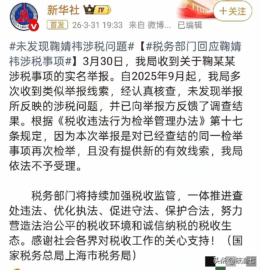 鞠婧祎的底气来了 近日,鞠婧祎被多人举报涉嫌偷税漏税,看了税务局的公报结果,才知道鞠婧祎敢一直光明正大不断工作的原因 税务部门回复鞠婧祎涉税事项,多次收到类似举报,经认真核查,未发现举报所反映的涉税问题,已向举报方反馈了调查结果 鞠婧祎这是动了谁的“蛋糕”,还是得罪了人了?多次被人实名举报涉税问题,所幸遵纪守法,不被影响