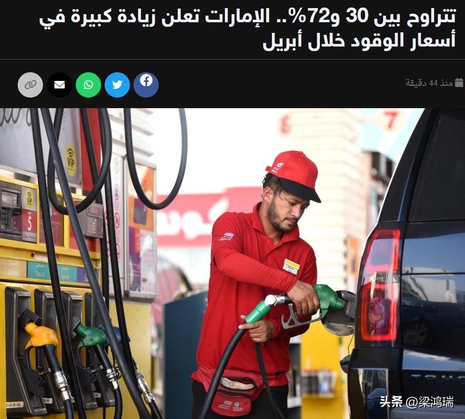 阿联酋宣布大幅提高燃油价格,涨幅高达72%: 柴油:上涨 72.4%(4.69 迪拉姆/升) 98号汽油:上涨30.8%(3.39迪拉姆/升) 95号汽油:上涨32.2%(3.28迪拉姆/升) 91号汽油:上涨33.3%(3.20迪拉姆/升)