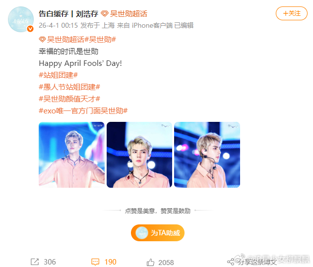 刘浩存站姐发吴世勋愚人节刘浩存站姐发了花仙子吴世勋,幸福的时讯是世勋愚人节站