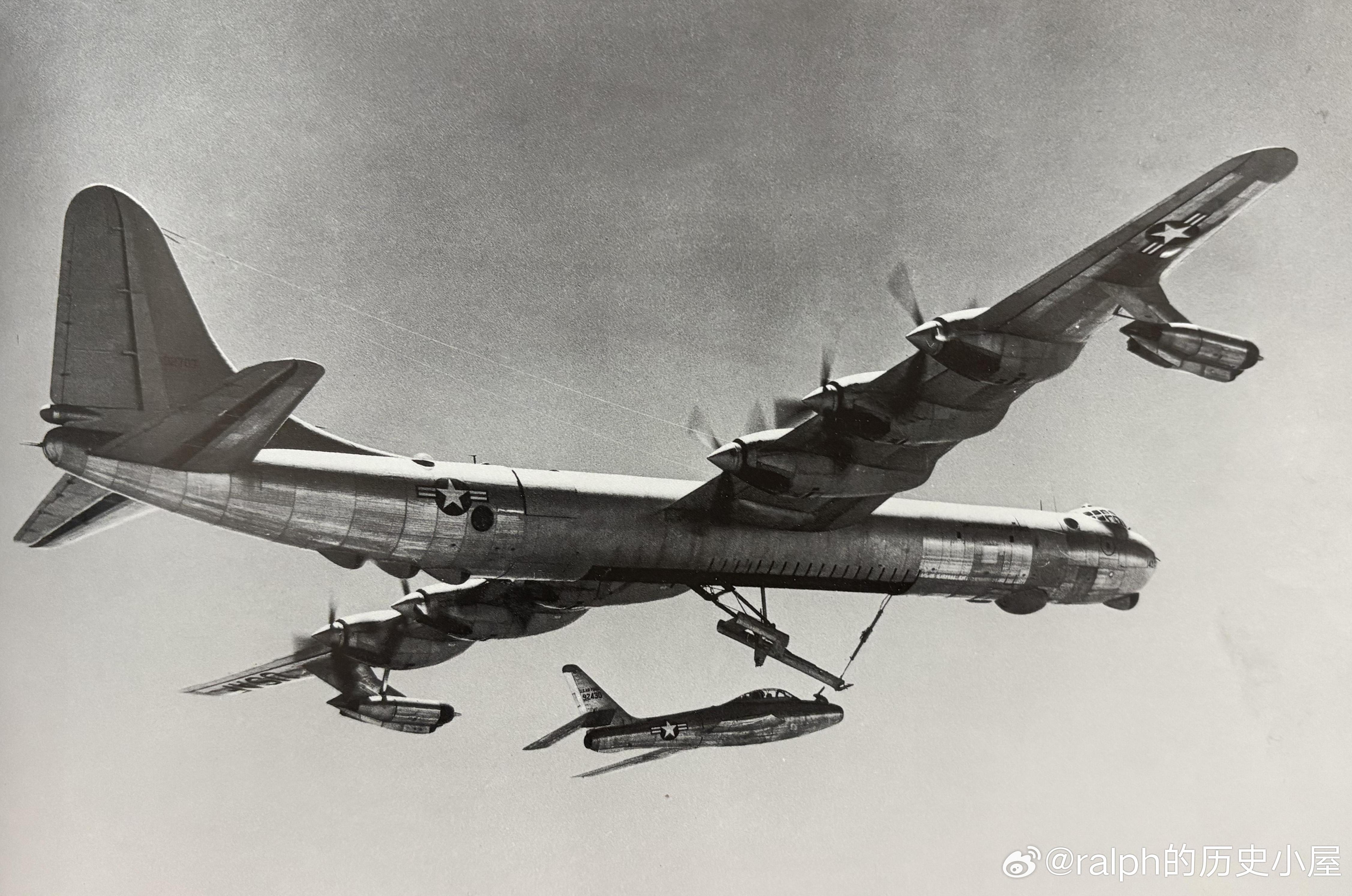 一架飞行中的GRB-36F,机腹悬架可以系留1架YRF-84F战斗机,寄生在母机上的战斗机可以在被释放后保护母机安全军事历史全触达