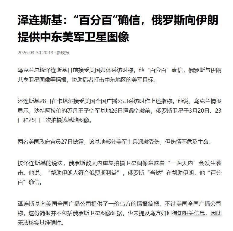 乌克兰悄悄派技术员去中东,泽连斯基突然说俄伊联手,伊朗反手告上联合国 3月26日那天,沙特有个苏丹王子空军基地遭到伊朗导弹袭击,这个地方靠近红海一带,平时气氛比较安静,导弹没有造成太大破坏,但消息传得很快,美国、以色列和沙特方面都紧张起来,一开始人们觉得是伊朗自己动的手,因为最近伊朗和以色列在加沙地区闹得挺厉害。 到了3月28日,泽连斯基和美国记者谈话时突然提到,说这次袭击是俄罗斯在背后帮忙,他说俄方卫星在3月20号、23号和25号三次拍摄了同一个基地,时间都卡在袭击发生之前,像是在提前踩点,但他没有拿出照片,也没有说明用的是哪种卫星或者数据从哪来,记者追问的时候,乌克兰方面只回了一句“情报部门已经确认”,之后就没再回应,这个说法听起来有点悬,可当时没人细问,因为美国刚被曝光正在催促乌克兰从顿巴斯撤出一部分部队,换取一些安全方面的承诺。 其实那几天,乌克兰在中东有不少动作,他们悄悄派了几支反无人机小队去了沙特、阿联酋和卡塔尔,这些小队不是去打仗的,而是教当地人员怎么防御无人机,帮着安装雷达、调试系统,还签了几个合作备忘录,这些国家缺少实战经验,乌军这几年经常被无人机袭击,反而练出了一套实用方法,他们要的东西不多,就是柴油、零件,偶尔加点军事援助,这件事没有公开宣传,但他们确实做了。 伊朗在3月30日坐不住了,直接向联合国发了一封信,他们的常驻代表伊拉瓦尼说,乌克兰派出了几百名军事专家到海湾国家,帮助建立反伊朗的防御体系,这等于参与了中东地区的武装冲突,违反了联合国宪章的规定,这是伊朗第一次正式把乌克兰列入中东冲突的名单中,不是口头指责,而是走法律程序,信里没有提供具体证据,但语气非常强硬,明显是为了表明立场——乌克兰不再是受害者,而是美国的帮手。 有意思的是,俄罗斯这边一直没否认跟伊朗有军事合作,比如卖无人机零件、修导弹发射车,但它坚决说没提供卫星情报,这话听起来像是撇清关系,实际上挺聪明,因为它承认有限合作,但不碰情报这种高危领域,它知道一旦被坐实帮伊朗打沙特,美国就可能翻脸。 乌克兰试图通过"俄伊联手"的说法让欧美相信冲突仍在继续,需要维持援助,伊朗则努力将乌克兰塑造成干涉者形象以削弱其国际同情,俄罗斯夹在中间既要避免担责又希望保持与伊朗的关系,三方都在争夺话语主导权。 更实际的情况是,乌克兰的技术人员真的在沙特基地里转悠,他们穿着便装,带着笔记本电脑,蹲在雷达旁边调整参数,伊朗的导弹能精准打中目标,未必全靠自己研发,但有没有俄罗斯卫星提供支持,目前谁也拿不出确凿证据,泽连斯基的指控就像一次试探,想看看国际社会还愿不愿意继续当乌克兰的保护伞。 联合国那封信发出去后,安理会没有人急着开会,大家心里都清楚,中东和东欧的冲突已经连在一起了,以前人们把俄乌问题看作欧洲的事,把伊朗问题当成中东的事,现在才意识到,只要有人愿意插手其他区域,这些界限早就靠不住了。