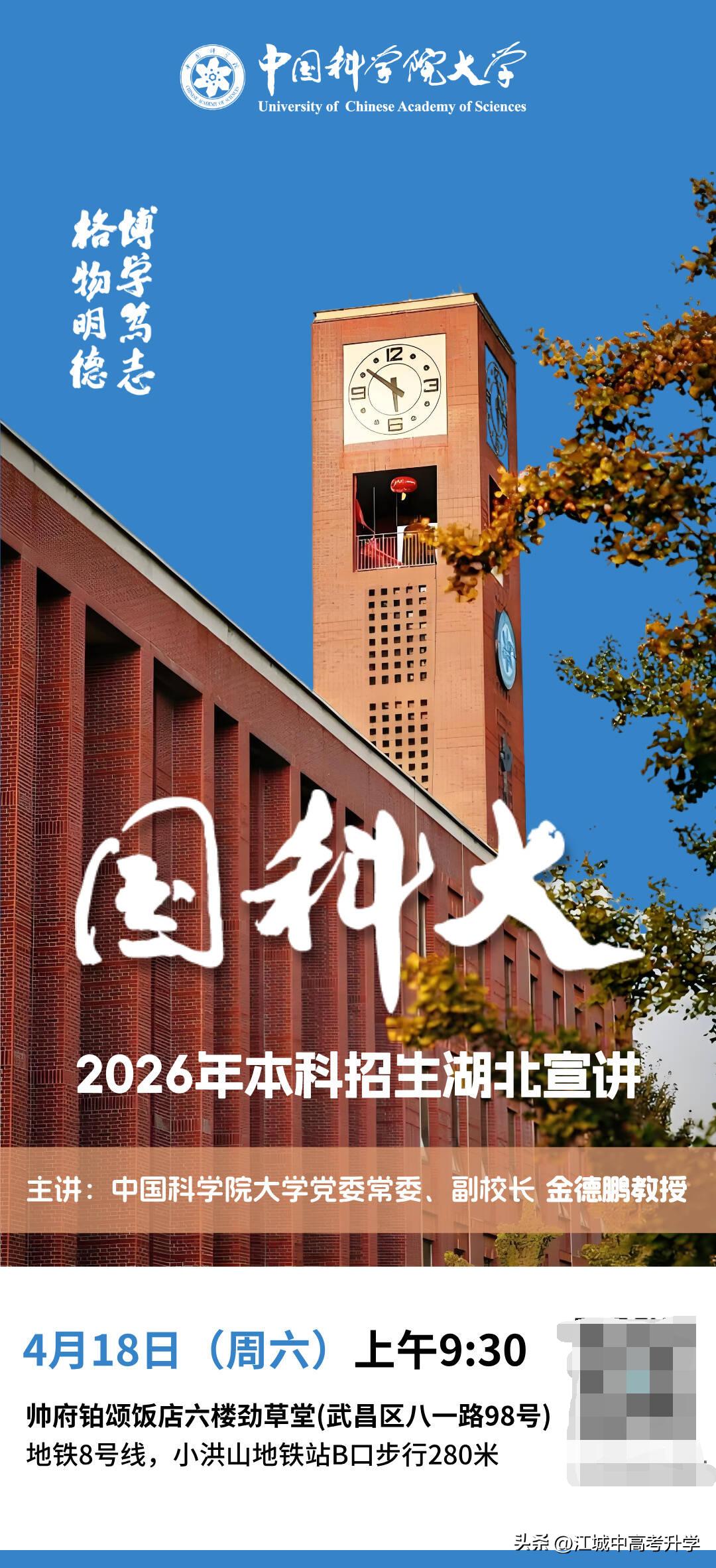 中国科学院大学2026本科招生湖北宣讲 如果想立志做科研的, 一定要选科研类大学, 会在一开始就埋下科研的种子, 做最专业的训练和培养, 科研的思维不是一朝一夕能练就的, 需要长期的熏陶和潜移默化的内化于心。 都说选择大于努力, 人生的关键的机会就那么几次, 在关键的时候能把握住 真的就能事半功倍, 而在做选择的时候更需要 有过人的智慧和勇气。 智慧是要建立在通盘考虑的基础之上的, 不能是东一榔头西一棒子的随波逐流, 而是是看清楚全局之后 做出的综合策略的分析, 是一种站在山顶一览众山小的运筹帷幄。 所谓的勇气是拿得起放得下的担当, 在面临选择的时候不能既要又要还要, 什么都想要就什么都得不到, 关键时候要懂得做取舍, 有壮士断腕的魄力。 知道自己能干什么,不能干什么, 知道自己要什么,不要什么, 分清自己想要、需要还是必要, 才是真正的通透和人间清醒。