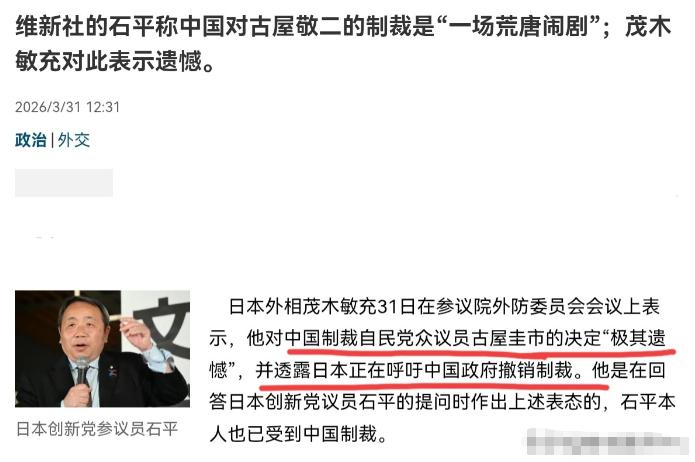 日本出来回应了!在我们制裁日本国会众议员古屋圭司之后,日本出来回应了!3月31日,日本外相茂木敏充31日在参议院外防委员会会议上表示,他对中国制裁自民党众议员古屋圭司的决定“极其遗憾”,并透露日本正在呼吁中国政府撤销制裁。对于日本的回应,我们怎么看呢? 说白了,日本外相茂木敏充对中方制裁古屋圭司的回应,表面是“表达遗憾、呼吁撤销”,实则是色厉内荏的外交表演,既想维护右翼颜面,又不敢真正对抗中方,本质是双重标准下的无奈妥协。 要知道,就在中方3月30日依法对古屋圭司实施制裁、明确传递反制信号的第二天,茂木敏充就在参议院外防委员会会议上发声,称对中方决定“极其遗憾”,还公开呼吁中国撤销制裁。可古屋圭司屡次窜台勾连“台独”、违背中日四个政治文件精神的劣迹斑斑,日方却只字不提,这番避重就轻的表态,活像做错事的人反过来倒打一耙。 可这绝非真心想缓和中日关系,而是日本对内安抚右翼、对外装强硬的政治操弄。古屋圭司是高市早苗政府的亲信,还是“日华议员恳谈会”会长,长期为右翼涉台言论站台,深受日本右翼势力支持。日方若不表态,会得罪国内右翼群体,影响政权稳定;可又清楚中方反制有理有据,不敢真正升级对抗,只能用“极其遗憾”这种温和措辞虚张声势。 说实话,日方所谓“呼吁撤销制裁”,完全是颠倒黑白、毫无道理。中方的制裁绝非随意而为,而是依据《反外国制裁法》,针对古屋圭司多次窜台、勾连“台独”、干涉中国内政的恶劣行径采取的必要反制,冻结其在华财产、禁止交易合作、拒发签证,每一项措施都合法合规、有理有据,目的是以儆效尤,维护国家主权。日方无视这一事实,反而要求中方撤销制裁,本质是想纵容政客继续挑衅中国红线。 并且,日本的回应背后,藏着自身难以言说的软肋——对华经济与供应链的高度依赖。日本经济产业省数据显示,日本有1406个品类的超一半进口额来自中国,远超美国、德国,从家电到稀有金属,供应链对中国依赖度极高。若因制裁事件导致中日关系恶化,日本企业将首当其冲,民生也会受到直接影响,这是日方不敢硬刚中方的核心原因。 更关键的是,日方全程回避核心问题,暴露其在台湾问题上的投机与虚伪。中日四个政治文件早已明确规定,日本应承认台湾是中国领土不可分割的一部分,只同台湾维持民间和地区性往来,这是中日关系的政治基础。可日方纵容古屋圭司窜台、鼓噪日台“军事交流”,违背自身承诺,如今又反过来指责中方反制,完全是双重标准。 要清楚,当年日本在历史问题上多次回避过错、颠倒黑白,试图模糊自身责任,最终都被国际社会谴责。历史总是相似,大国交往的底线是相互尊重,日方若始终回避自身错误、纵容政客挑衅,只会不断损害中日关系根基。中方的反制,从来都是对挑衅者的警告,就像当年中方针对各类反华政客的惩戒一样,谁触碰中国红线,谁就必须付出代价。 而未来,日本大概率会继续维持这种“嘴硬心软”的姿态,一边偶尔发声呼吁中方撤销制裁,一边不敢真正升级对抗,甚至会悄悄约束右翼政客的涉台言行,避免局势进一步恶化。中方则会坚定维护自身主权,制裁措施绝不会撤销,若日方继续纵容政客窜台、勾连“台独”,中方不排除进一步扩大制裁范围、收紧合作渠道。关键转折点就看日方能否正视自身错误,切实恪守一个中国原则和中日四个政治文件精神,停止纵容反华势力,否则中日关系只会持续陷入僵局,最终受损的还是日本自身。 说到底,茂木敏充的回应,本质是日本在挑衅中国与维护自身利益之间的两难挣扎。既想靠纵容右翼、干涉台湾问题讨好美国、安抚国内势力,又怕得罪中方、付出经济代价,这种“既想当又想立”的心态,最终只会让日本陷入被动。中方的反制,是捍卫主权的正义之举,也是对日本的明确警告:任何干涉中国内政的行为,都必将付出应有的代价。 以上是小编个人看法,如果您也认同,麻烦点赞支持!有更好的见解也欢迎在评论区留言,方便大家一同探讨。
