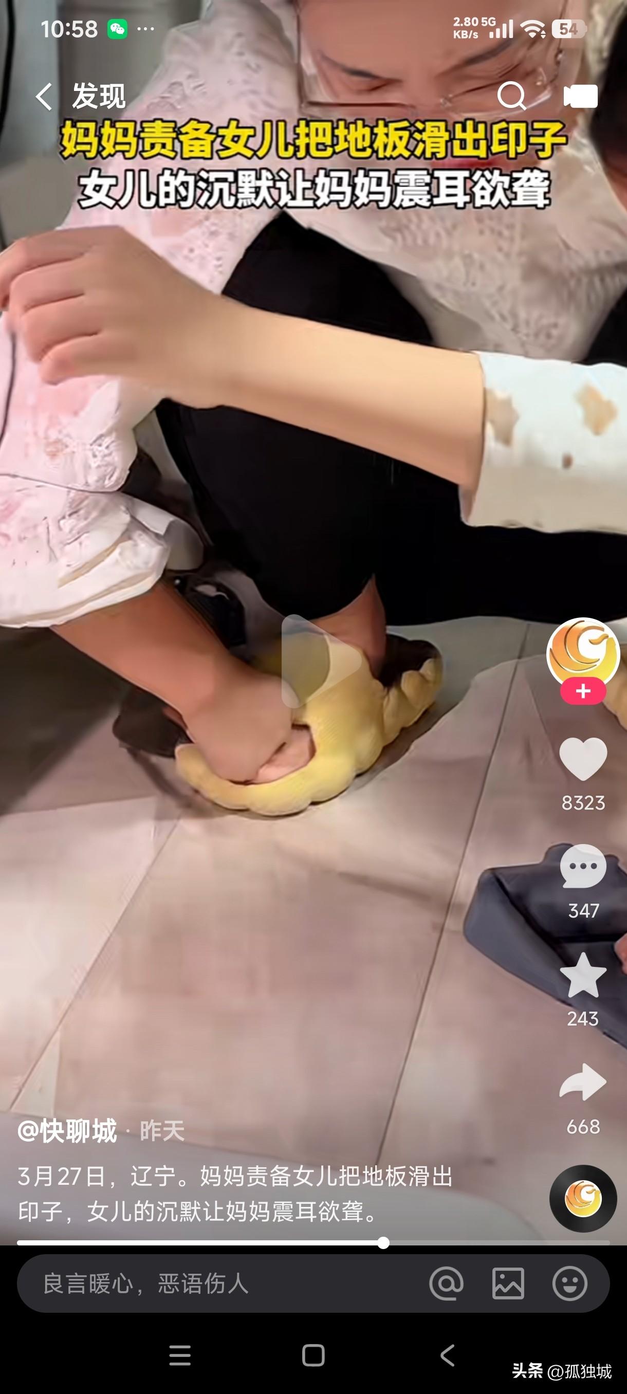 戴眼镜的人四只眼有时都不好使吗? 妈妈愤怒的责备女儿把地板滑出印子擦都擦不掉,女儿沉默了一会,伸手把那印子用手晃了一下,原来那不是地板上的印子,而是充电器线照在地上的光印! 接下来的操作顿时让女儿也傻眼了,没想到妈妈没有认识到自己的错误,反而震耳欲聋的大声咆哮女儿不懂事,遇到如此胡搅蛮缠的妈妈,这当女儿的日子会好过吗?