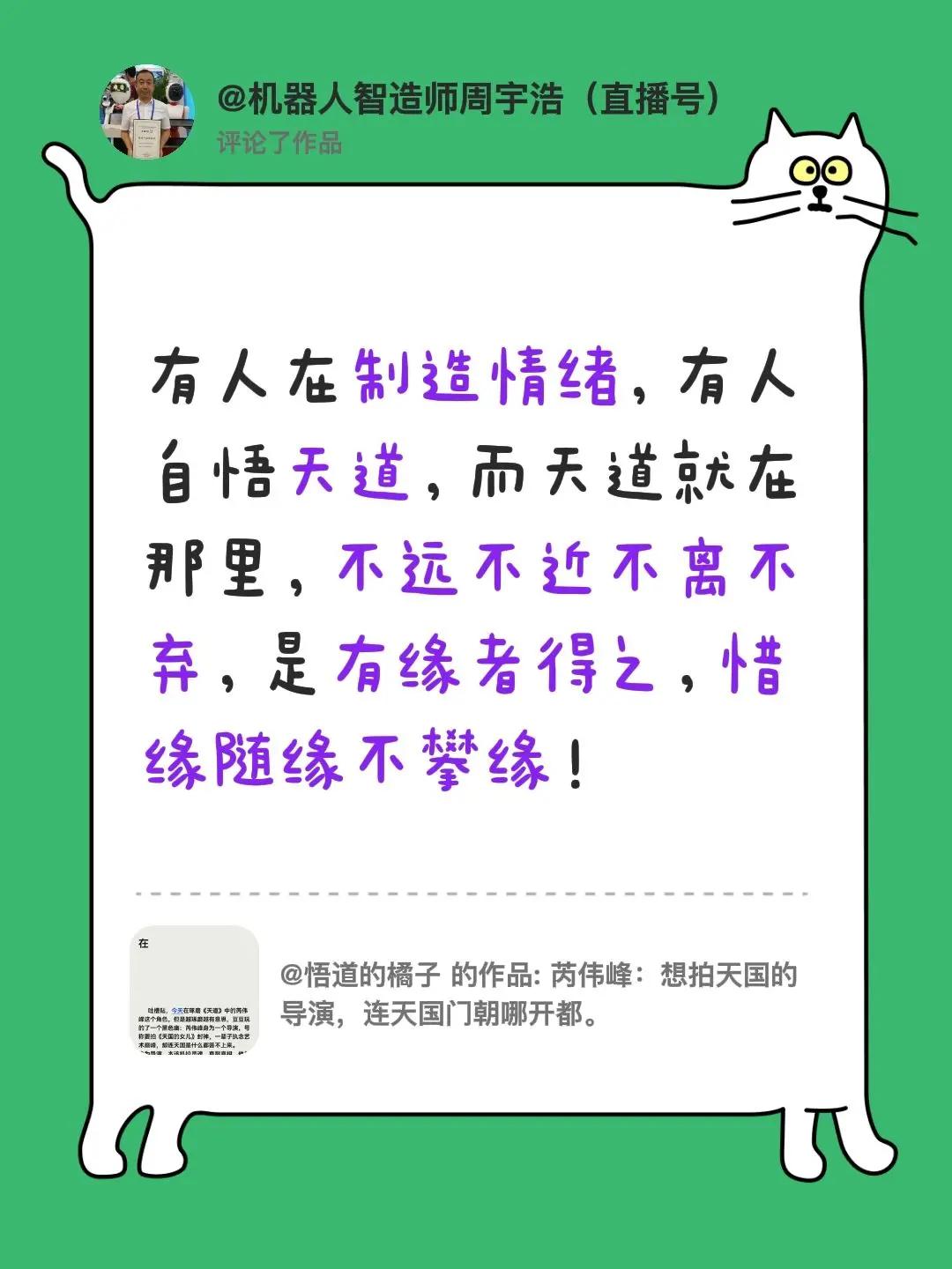 我评论了@悟道的橘子 的作品:有人在制造情绪,有人自悟天道,而天道就在那里,不远不近不离不弃,是有缘者得之,惜缘随缘不攀缘!