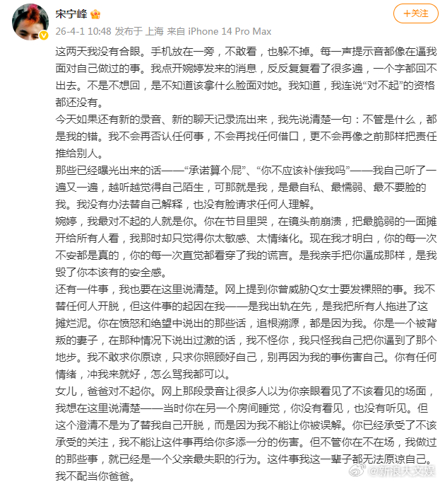 宋宁峰承认出轨宋宁峰 都是我的错 4月1日,演员宋宁峰针对婚内出轨事件发布长文道歉。1.承认长期欺骗行为,对妻子张婉婷道歉。2.回应张婉婷威胁Q女士发裸照事件,称根源在于自身出轨行为将她"逼到绝路"。3.否认女儿安娜目睹不当场面,称其"在另一房间睡觉"。