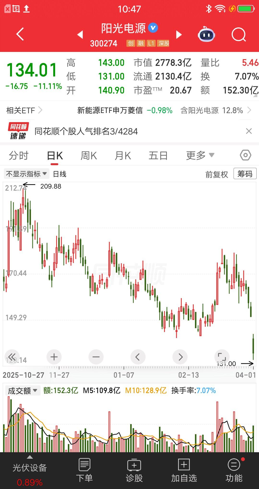 光伏今天最惨的票诞生了,两千多亿市值的盘子,相当于一个跌停板,恐怖如斯呀! 该票集合竞价大幅低开6.54%,竞价就有7.19亿资金砸盘,做空情绪相当严重。开盘后快速跳水,最大跌幅12.57%,肯定是有大资金砸盘,引发散户恐慌抛售。此后股价略有收窄,稳住后横盘运行。 消息面上,昨日该票发布了2025年报,全年利润增长22%,但是Q4同比下滑54%。同时板块调整,可能是两者同振,引发大跌。 当然咱们散户对基本面了解有限,能做的只有跟随,主力砸盘跟着跑就对了。思考太多,反而容易犯错。 今天之前买入的资金是最惨的,吃了一碗大面,常在河边走哪有不湿鞋,保持乐观心态吧。