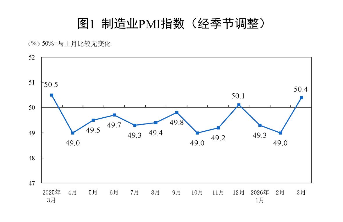 3月制造业PMI重返荣枯线,制造业景气回升创近一年新高,价格指数大幅上行驱动PPI预计同比转正。制造强于服务、内需+出口共振、上游价格强势、中小企业修复。 大、中、小企业景气度均上行,大型企业51.6%(扩张),中型49.0%、小型49.3%(收缩)。 …… 制造业 PMI 50.4% +1.4pct 扩张区间 制造业新订单 51.6% +3.0pct 扩张区间 制造业新出口订单 49.1% +4.1pct 收缩区间(边际改善) 制造业原材料购进价格 63.9% +9.1pct 高度扩张 制造业出厂价格 55.4% +4.8pct 高度扩张 …… 【产需同步上行,产需差收窄】生产指数回升1.8个百分点至51.4%,重返扩张区间;新订单回升3.0个百分点至51.6%,需求回升幅度高于生产。新订单、新出口订单、现有订单分别上行3.0、4.1、3.1个百分点,预计3月出口维持强势。 【价格走强,企业成本压力抬升】受大宗商品涨价驱动,购进价格、出厂价格分别上行9.1、4.8个百分点,均触及2022年以来高位,企业成本压力抬升。 【建筑业PMI】+1.1pct,49.3%,回升主要依赖基建,房建板块继续走弱。 …… 1、制造业价格指数接近四年高点,预计3月PPI同比转正。 2、上游涨价向中下游传导,成本压力逐步显现。 宏观在左,交易在右,资本永不眠!
