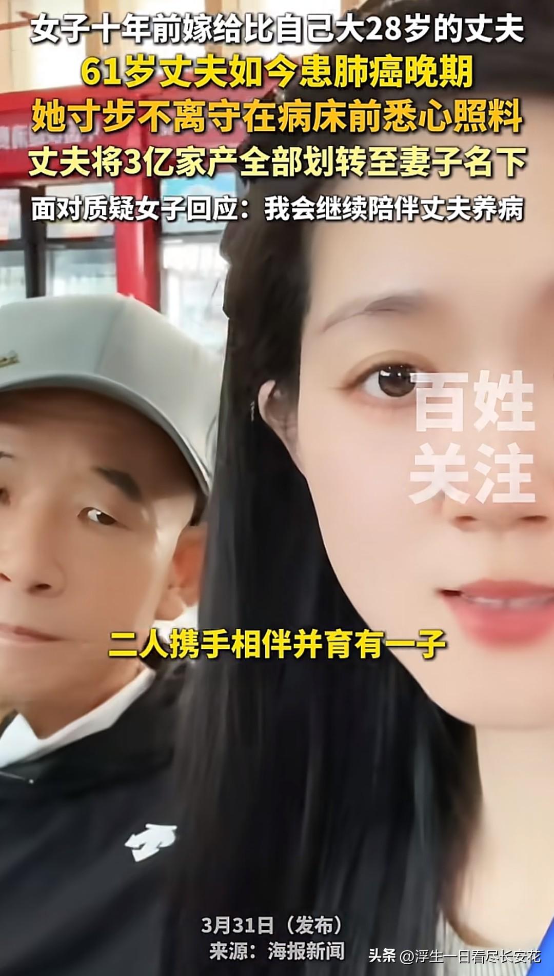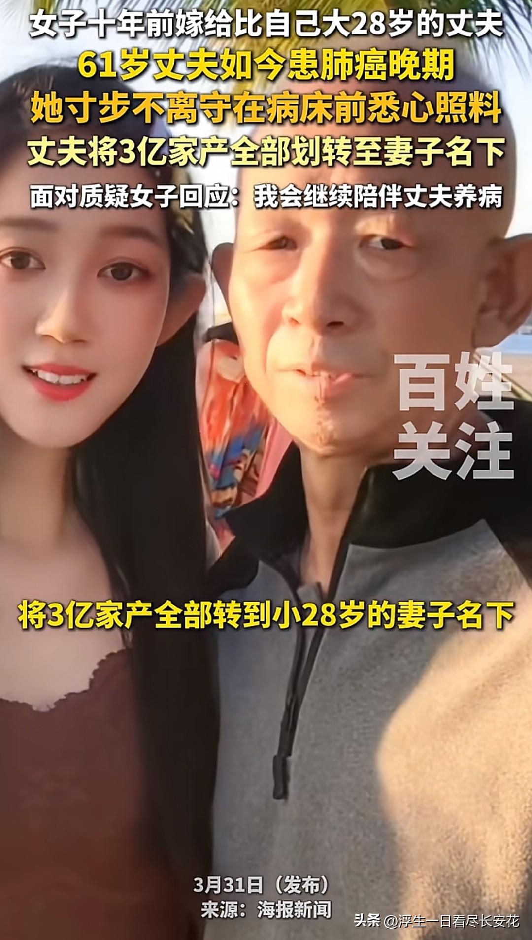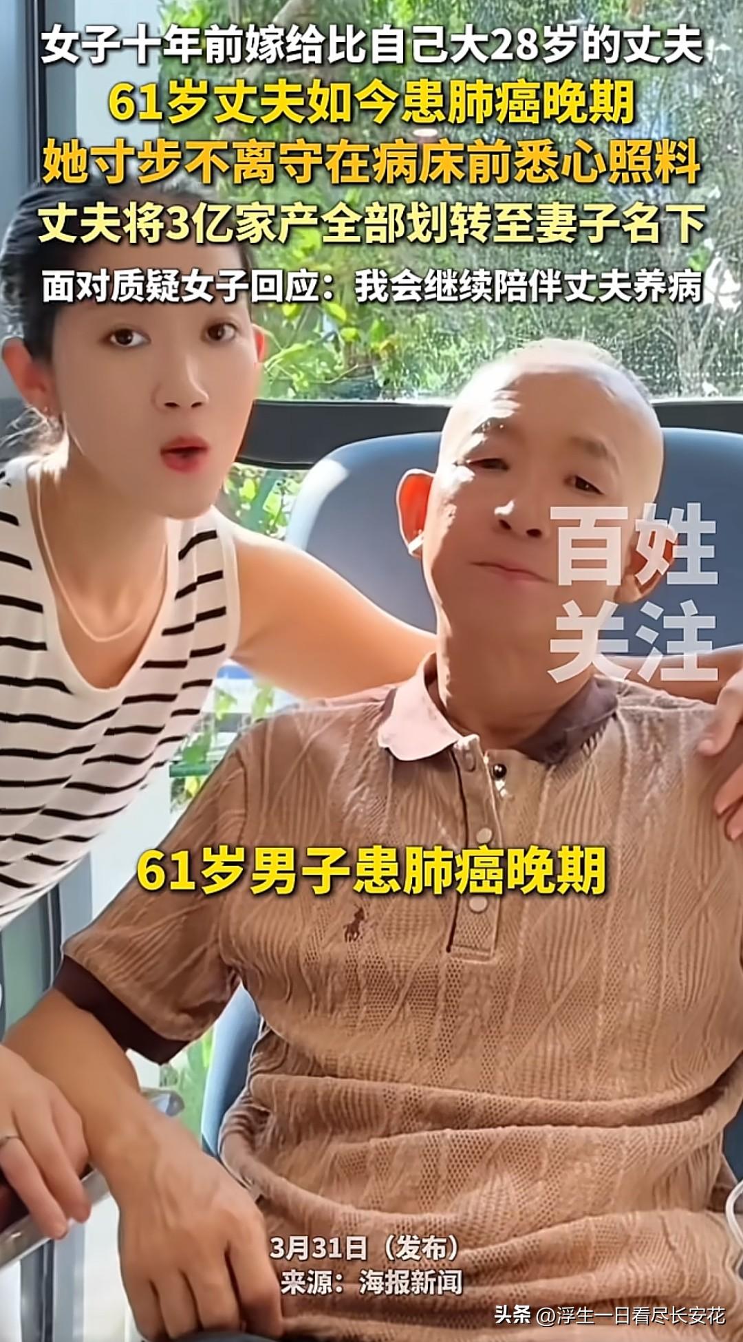 十年前,莉女士顶着外界的质疑嫁给大自己28岁的丈夫,如今丈夫患肺癌晚期,她寸步不离悉心照料,最终丈夫将3亿家产全部划转至她名下。这在外人看来,像是一场精心策划的“创业”,十年的付出终于得到了回报,甚至有人调侃她“做梦都会笑醒”。 但只有她自己知道,这十年的陪伴和付出,绝不是为了那3亿家产。她要照顾丈夫的饮食起居,要处理家庭的大小事务,要忍受外界的流言蜚语,这些都不是用金钱可以衡量的。就像她面对质疑时回应的那样:“我会继续陪伴丈夫养病”,这不是一句空话,而是她十年如一日的承诺。 其实,婚姻从来不是一场交易,而是两个人相互扶持、相互陪伴的旅程。她用十年的时间,证明了自己对丈夫的爱,而丈夫用3亿家产,回应了她的付出。在这个充满物质和利益的社会里,这样的感情显得格外珍贵。 希望大家能多一些理解和包容,少一些质疑和猜测,不要用自己的偏见去评判别人的生活。 对此,大家怎么看呢?欢迎留言。